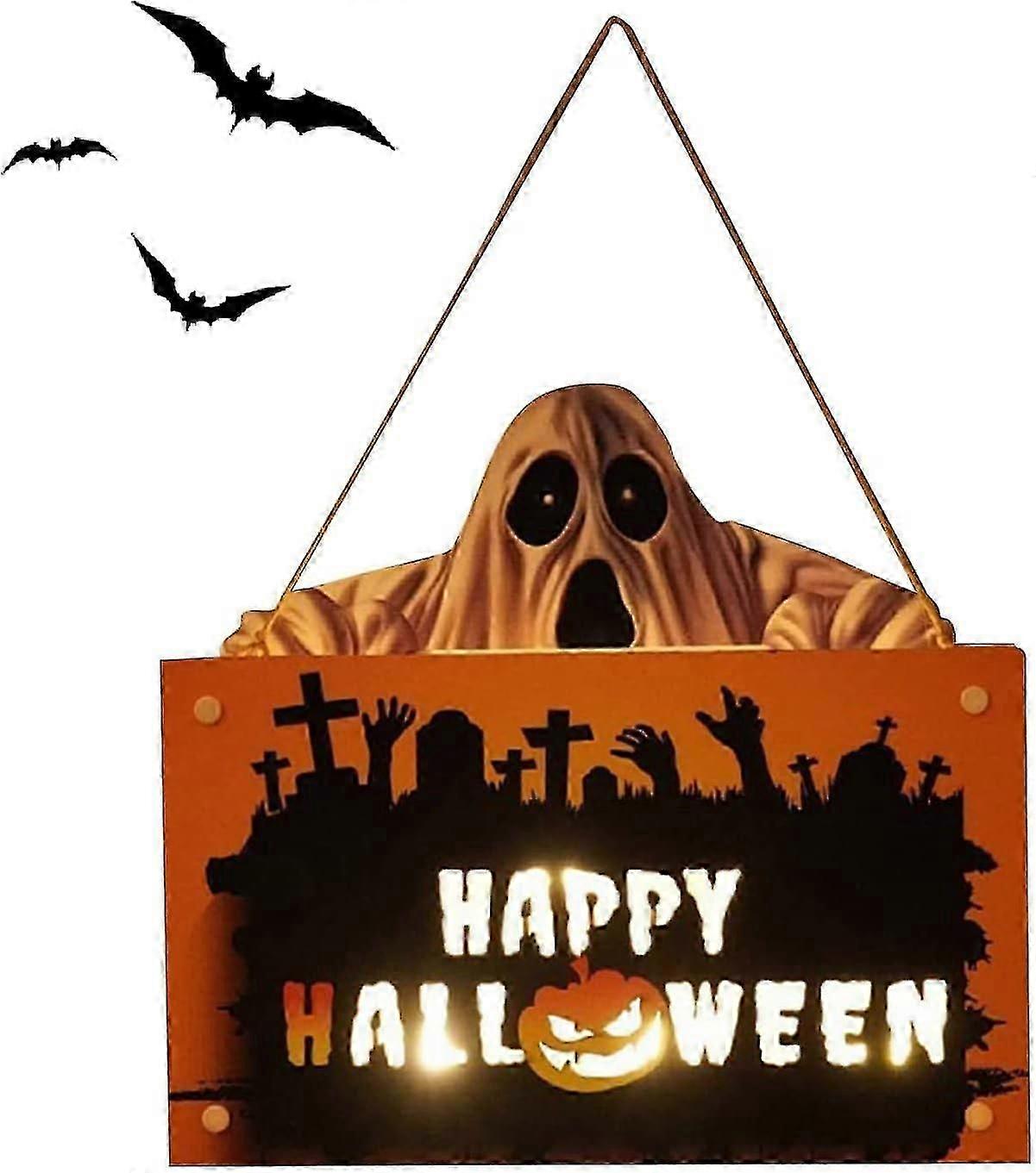 Hanging Christmas Signs Outdoor Indoor, Halloween Wooden Hanging Sign Decoration Lights,Pumpkin Ghost Horror Atmosphere Door Light Decor