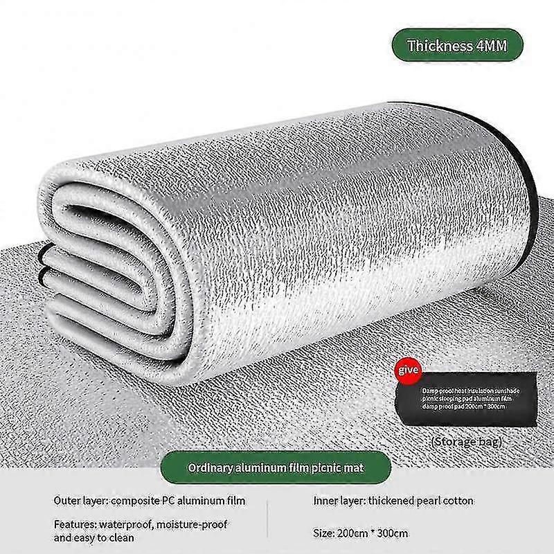 Tent Mat Thickened Moisture-proof Mat for Outdoor Picnic Double-sided Aluminum Foil Folding Sleeping Pad Camping Floor Mat Specifications: Product name: aluminum film moisture-proof mat Outer layer material: composite PVC aluminum film Inner material: thickened pearl cotton Size: 4MM (90*200cm), 4MM (150*200cm), 4MM (200*200cm), 4MM (200*300cm), 6MM (150*200cm), 8MM (150*200cm), 8MM (200*200cm) Features: waterproof and moisture-proof, easy to clean Use scene: outdoor picnic, home, mattress, etc. Description: Thickened pearl cotton, large elasticity, more comfortable to lie down Exquisite hemming with thick non-woven fabric Really thickened tear resistance performance upgrade Upgraded non-woven fabric edge tear resistance Upgraded embossed fit is tighter and better moisture-proof Double-sided high-quality aluminum film, which has good heat reflection energy to achieve heat insulation, moisture-proof and moisture-proof effects The aluminum film has strong waterproof performance, oil and dirt, water repellent and not easy to stick to weeds and dust, making cleaning worry-free and labor-saving Easy to clean, fast and worry-free stain jam don't be afraid Removes easily with a wipe with a tissue Equipped with a convenient storage bag, easy to store in one roll and one plug. Small size and lighter to carry Convenient storage and travel is easier Package Included: 1*moisture-proof pad 1*storage bag