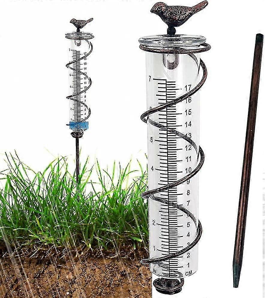Stylish & Sturdy DesignUpgrade your outdoor decor with our stylish spiral metal bracket and reinforced metal ring at the bottom. Hang the glass rain gauge with ease using the circle designed near the top of the spiral. Easy to Read & TrackOur wide opening rain gauge can collect most rainfall volume and has a dual scale of 7 inches/170mm for easy tracking. Never miss a drop Easy to Install & MaintainFix the rain gauge on the ground or hang it on the fence, record results, and empty the tube for the next rainfall. It's convenient and won't get dirty. Durable & Long-LastingCrafted from superior quality glass, our rain gauge won't get cloudy from long-term exposure outdoors. The frame is made of pure metal, which is durable and won't fade or deform. Perfect Gift for GardenersThis heavy-duty rain gauge is an essential tool for any gardener, making it the perfect gift for family, friends, and neighbors who love to garden.