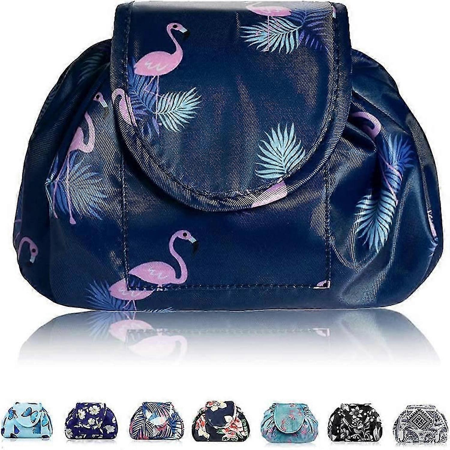 Drawstring Make up Bag,Portable Travel Bag Storage Organiser (Dark Blue Flamingo)