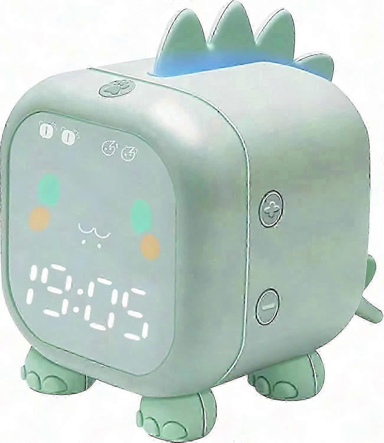 Description Dream Timer Night-light Sleep TrainerThe digital alarm clock for kids is designed with dinosaur shape,kids will love and excited to recive this cute gift when they see its expression.The cute childrens digital display alarm clock night light can be timed for 1-60 minutes.The cute dinosaur lamp with soft colorful lights offers your baby a gentle companion, it is a good choice for training children to develop good sleeping habits.Flexible Alarm SettingThe alarm clock has dual alarms that make it possible to set two different times in one day, you can get 5 minutes snooze time by touching the night light button, press any button to quit snooze. The alarm will ring again when the 5 minutes over and it will repeat for 3 times. You also can set different alarm clocks according to different dates to cater to your working need:from Monday to Friday, from Monday to Saturday or from Monday to Sunday.Intelligent Sunrise Sunset SimulationThe wake up light alarm clock digital comes with sunrise sunset mode.When set your sunrise time, the green light will gradually get brighter from 0% to 100% which wake you from deep sleep and to give you a good mood in the morning. While the sunset simulation is the opposite, the warm white lights gradually dim from the brightness light to completely black out and to give you the best nights sleep environment.Multifuntional DesignThe digital dinosaur alarm clock has 6 types of music ring-tones and the volume could be adjusted by pressing few buttons (English instruction provided). At the same time, it also has thermometer and date display function.The dinosaur alarm clock uses rechargeable lithium-ion battery, which is more environmentally friendly and energy-saving that it can be charged through the USB port.Great Gift 100% SATISFACTIONThe dinosaur alarm clock with the smart function can not only be used to decorate the room, but also develop the childrens ability to sleep alone. It is a great birthday and holiday gift for children, suitable for bedroom, childrens night light, leisure, outdoor camping. It is comprised of Safe Abs and Silicone, Sleep Traning Clock is Fcc, Ce, Rohs Approved which makes it durable and 100% SAFE FOR KIDS,please rest assured to buy.
