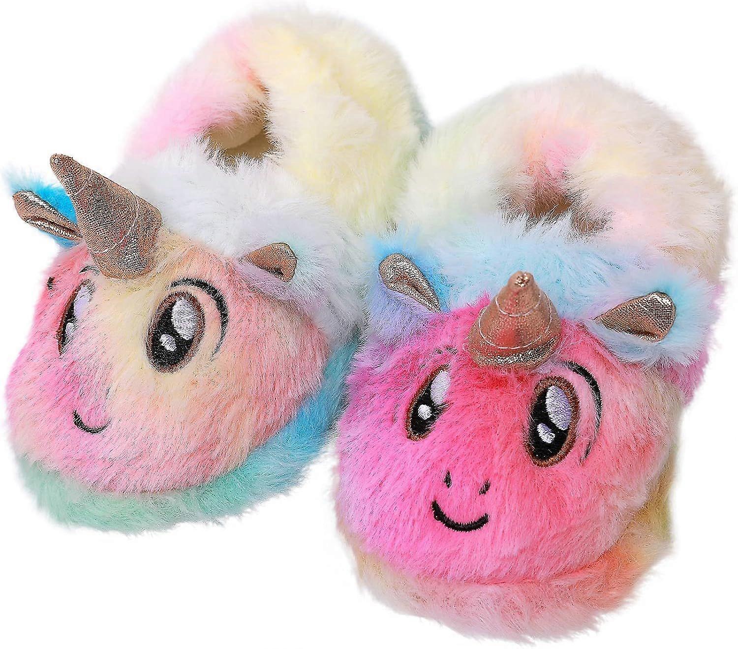 Toddler Boys Girls Fuzzy Slippers Cute Unicorn Tie Dye Cartoon Animal Warm Cozy Plush Indoor Slip-On Kids House Shoes