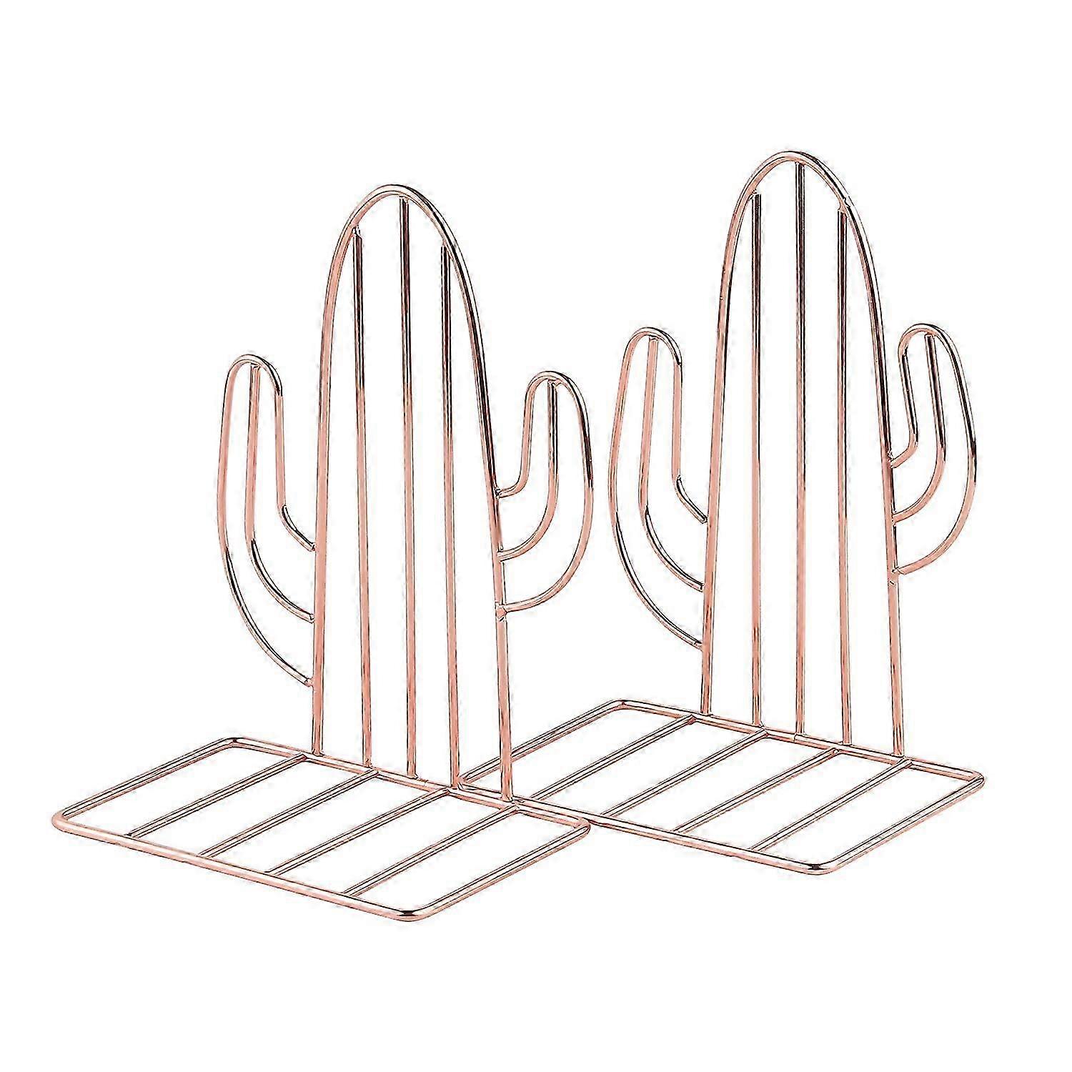 Geometric Cactus Bookends, Non-Slip Metal Shelf Holders (Rose Gold, 1 Pair)