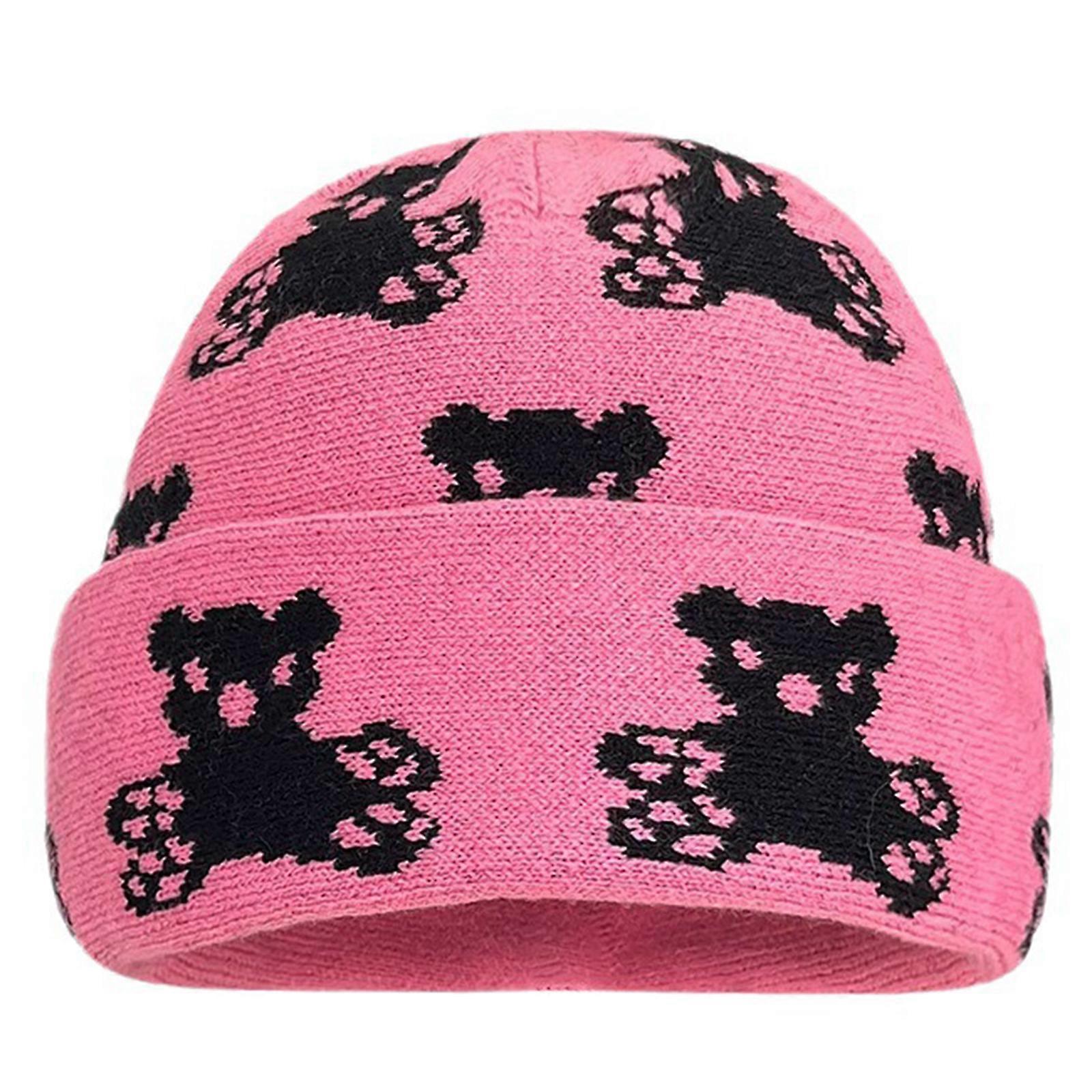 Elastic Windproof Beanies Knitted Jacquard Bear Pattern Hat for Women Men Keep Ear Warm Hat Cold Weather Supplies Pink