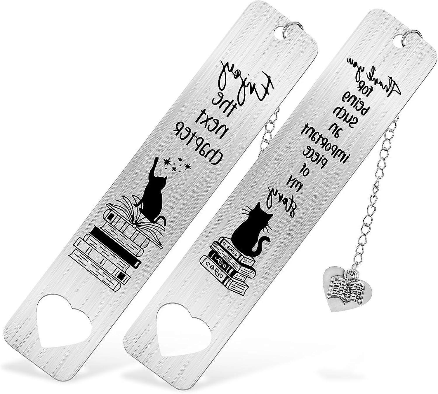 [Inspiring Words to Show Your Love]"Enjoy the next chapter"to encourage people of bright future,and "Thank you for being such an important piece of my storyto express you sincere gratitude to your beloved one.The cat book mark adopts a cute cat design, easy to attract people's attention, bringing you a nice reading experience. [Stainless Steel & Long-lasting Storage]The inspirational bookmarks is made of stainless steel material that is no rust, no allergies.It will be a long-lasting keepsake and it fits most books well. [Small Prizes]The cute bookmarks are nice class prizes or gifts for elementary students to encourage them of optimistic attitude. Children will be very happy after receiving the book markers. [Easy to use]The little cat helps you mark the important content. A single cute bookmark is light in weight, easy to carry and store which is damage free to books and meets various needs.It is very suitable for schools,homes,meetings or offices. [Confirmation Gifts]The cute patterns make people motivated to read. The cat bookmark is a good gift for classmates,children,teachers,and friends,especially cat lovers,help to enable a pleasant life!