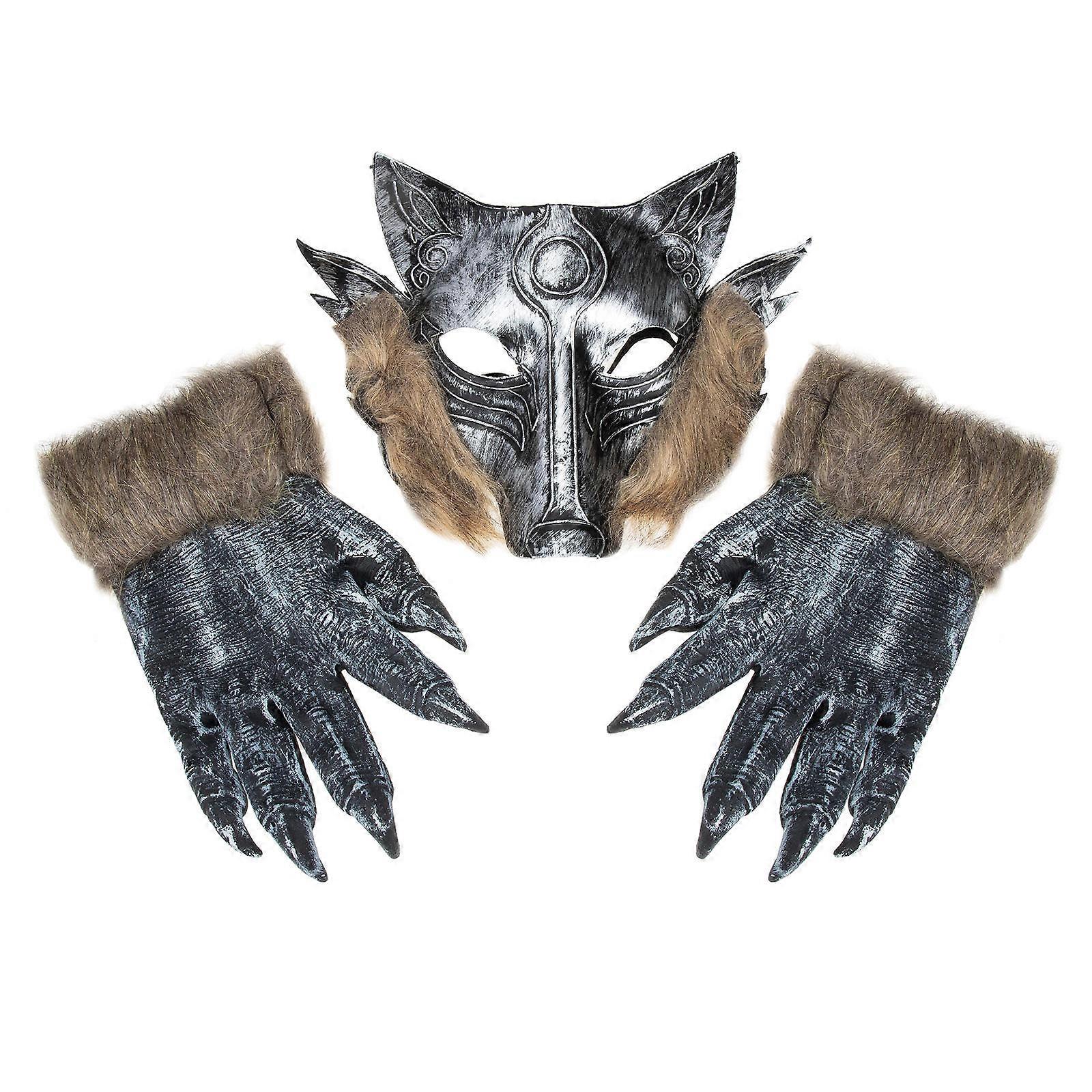 Scary Wolf Mask And Claw Gloves Set For Halloween Party Realistic Design Assorted Color 27.5x21.5cm Halloween Costume 1Set