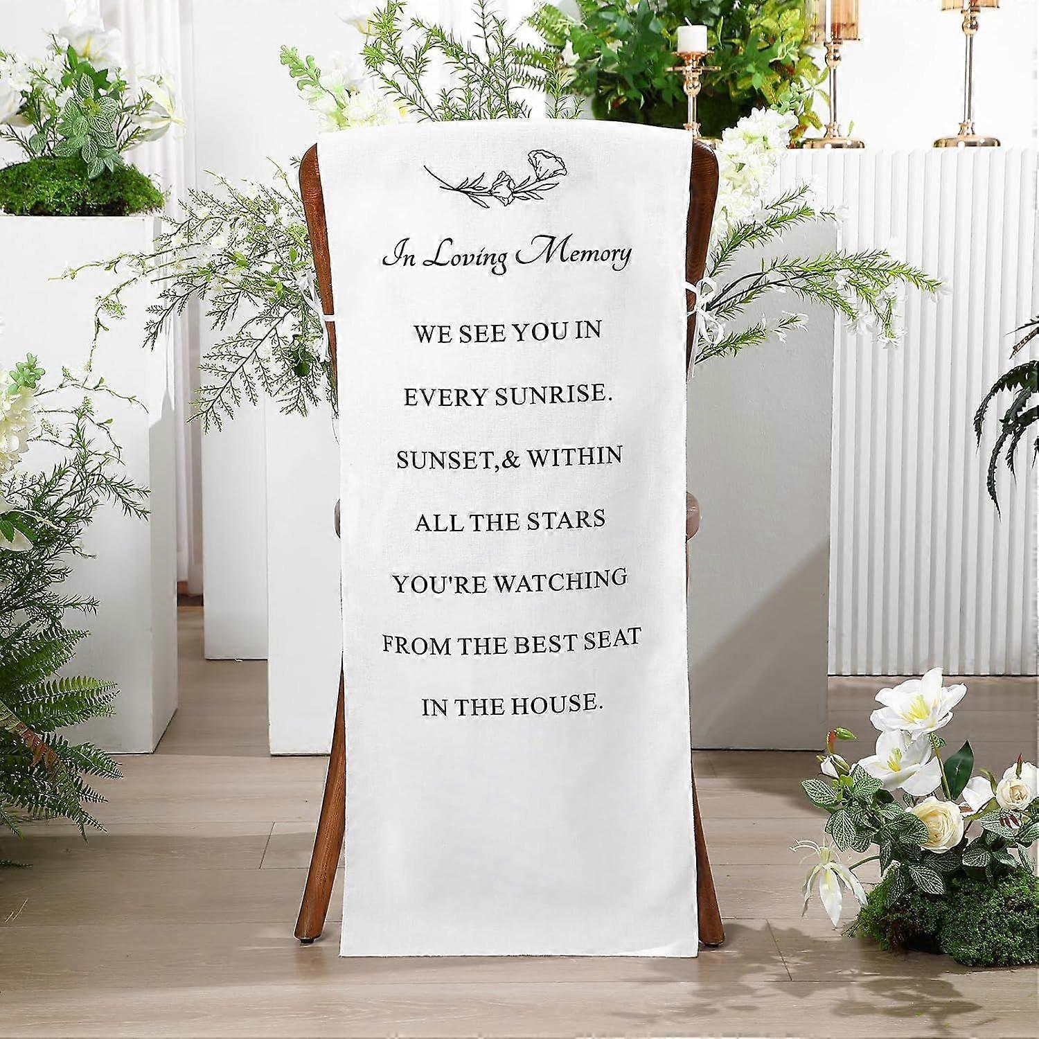 Quality Material: our wedding seat sign is made from a durable 200g blend of linen and cotton, thereby ensuring a long lifespan; Easy to fold, carry, and store, this wedding memorial ensures that your loved ones' presence will be felt at every important event, making it an integral part of your reserved signs for the wedding Comforting Bereavement Gift: this impressive yet serene design offers a lovely keepsake during times of remembrance, grief, and funerals; A thoughtful condolence gift, it serves as a lasting reminder of the angels' presence and the eternal bond shared with those departed Ideal Size for Visual Appeal: with measurements of 15 x 50 inch/ 38 x 127cm, the wedding memorial sign provides ample room for decoration; You can personalize it according to your needs, making it the ideal addition to your reserved signs for wedding chairs Thoughtfully Designed Wedding Sign: decorated with delicate words on a crisp white ribbon and black text, our wedding chairs reserved signs are meticulously designed to suit any wedding setting; The tasteful color scheme and elegance of the sign enhance your wedding decorations and lets your guests reserve their seats with ease Touching Wedding Memorial Accessory: elevate the sentimental value of your wedding with our touching wedding memorial sign; Specially designed to invite your loved ones in heaven to your ceremony, it serves as a loving memory sign, reserving a special place for them even in their absence; A cherished part of the wedding decor this reserved sign seamlessly connects your loved one in spirit