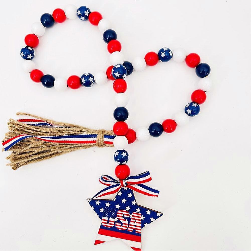 Patriotic Primitive Rustic Style Wood Flag Star Bead Garland Fourth of July