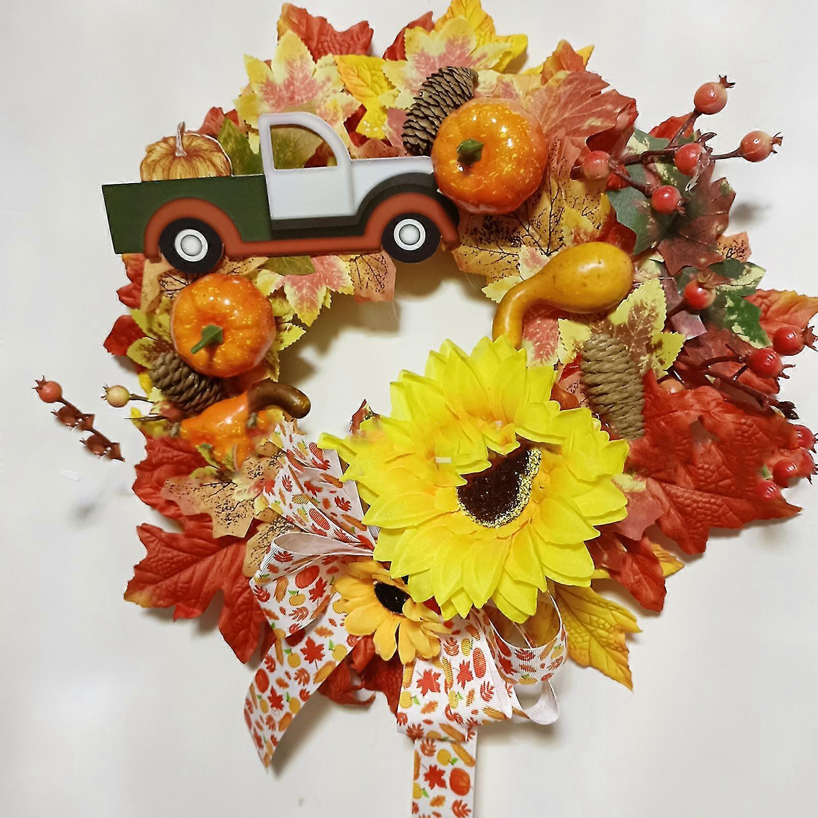 Handmade lifelike wreath with fiery colored maple leaves, pumpkins, and sunflowers. Made with high-quality silk cloth and rattan. Suitable for indoor or outdoor use. Perfect for decorating your home during the fall season, Halloween, and Thanksgiving. Great gift for family and friends. Measures 45 cm in diameter. Weighs 280 g.