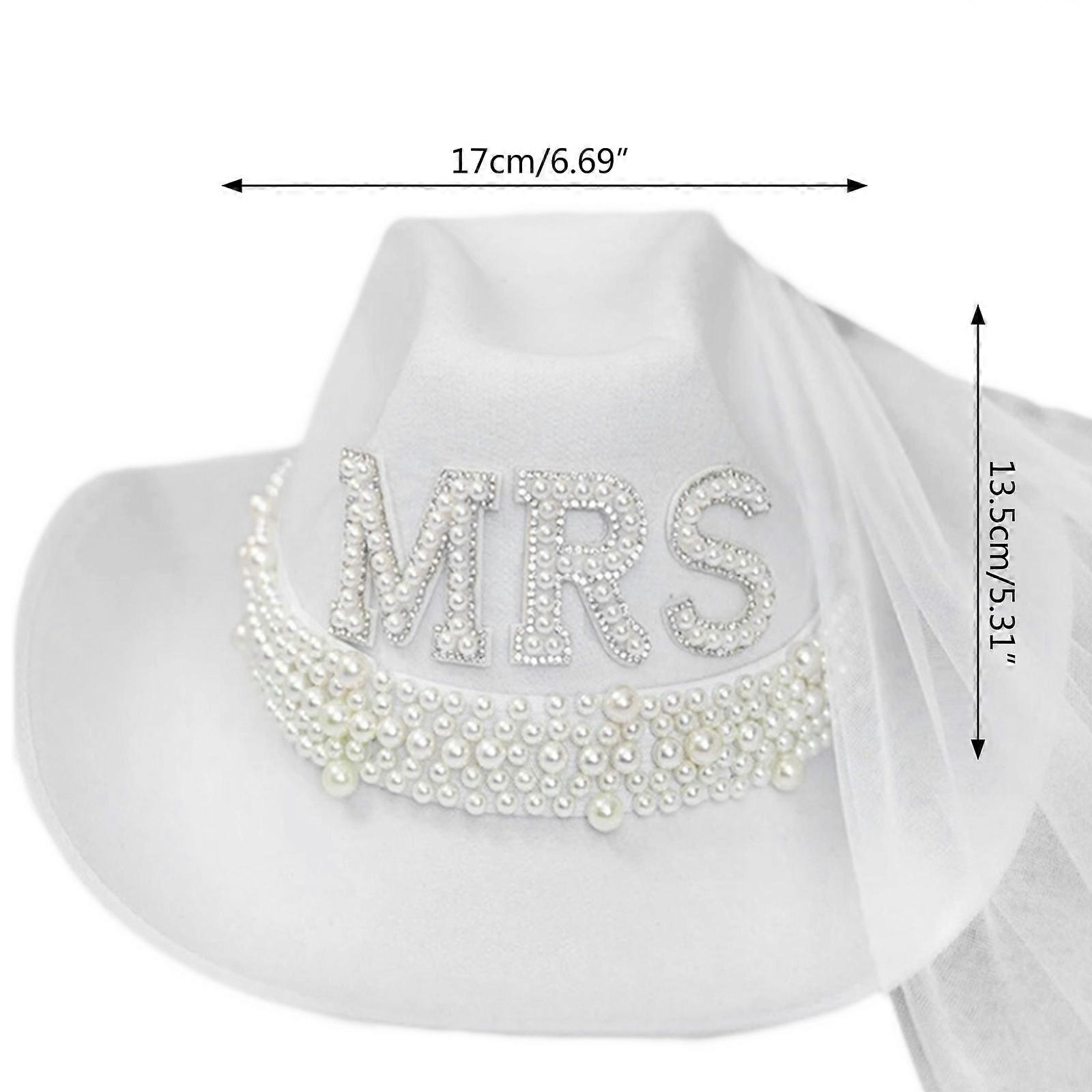 Handmade Wedding Party Bride Cowgirl Hat Wide Brim Bridal for Rhinestone Western Shinning White Fedora Hat Sunproof MRS Hat plus a veil