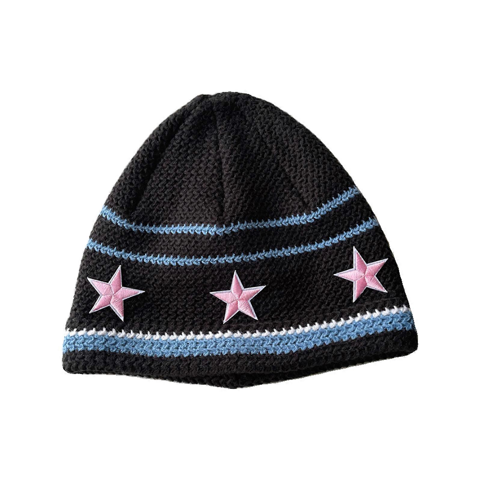 Handmade Striped Hat Y2K Sweet Girl StarPatch Bucket Hat Pilling-Resistant Autumn Winter Skull Hat Female Pullover Hat Black