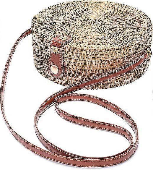 Handwoven Round Rattan Bag Shoulder Leather Straps Natural Chic Hand