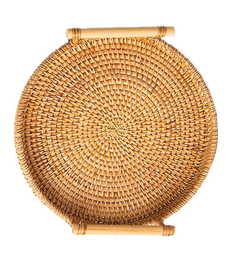 Hand Woven Round Rattan Serving Tray Bread Fruit Dessert Snack Basket with Handles Diameter 28cm Height 4cm