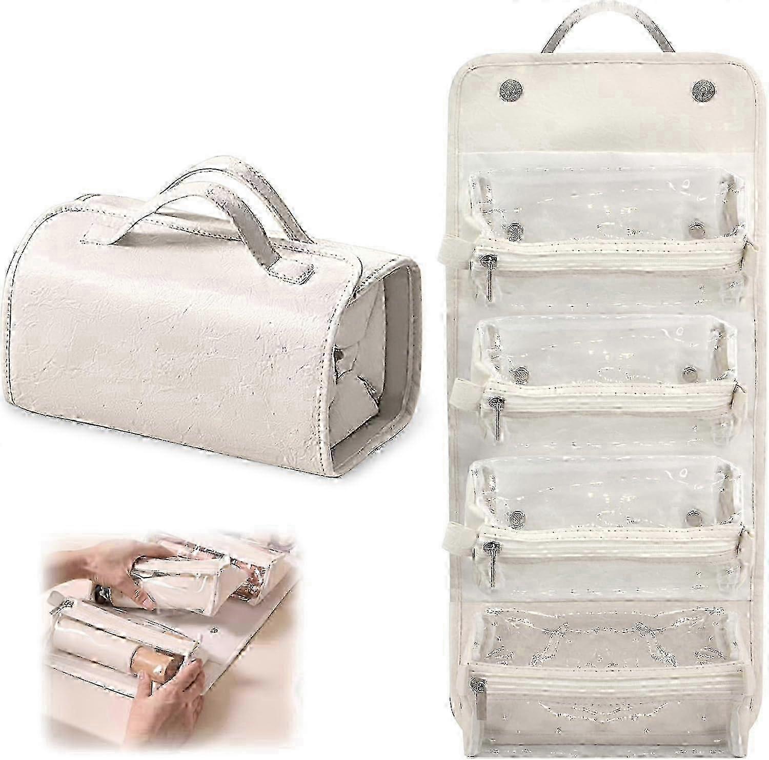 Folding Leather Waterproof Cosmetic Bag, Roll Up Travel Makeup Bag with 4 Detachable Clear Compartment Large Capacity Cosmetic Bags for Women