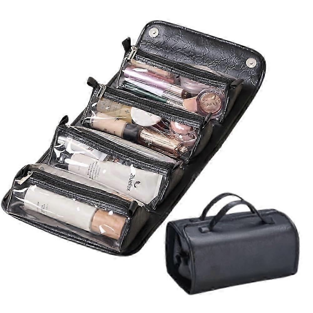 Folding Leather Waterproof Cosmetic Bag Litchi Stria Roll Up Travel Makeup Bag with 4 Multi Detachable Clear Compartment Hanging Large Capacity Cosmet