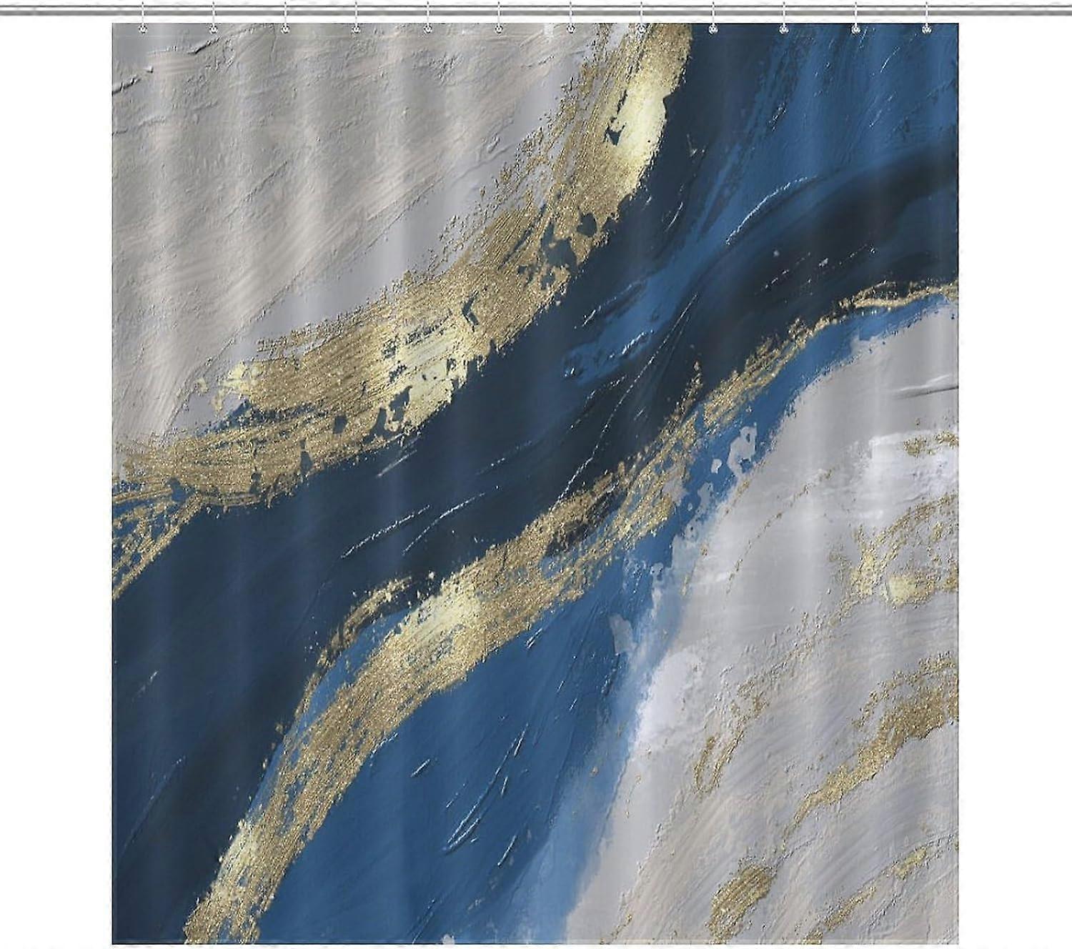 Abstract Oil Painting Shower Curtains, Shining Gold Flow Liquid Blue Grey Modern Abstract Luxury Decor Print Bath Drapes Set with Hooks, Waterproof Fa