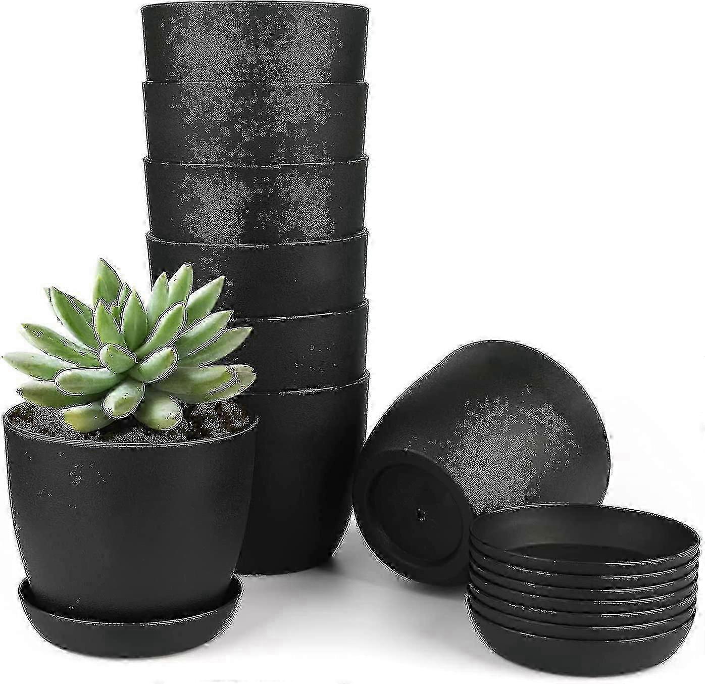 Black Plastic Flower Pots with Drainage Holes and Trays, 8-Pack 10cm Round Plant Pots for Succulents Herbs Cactus