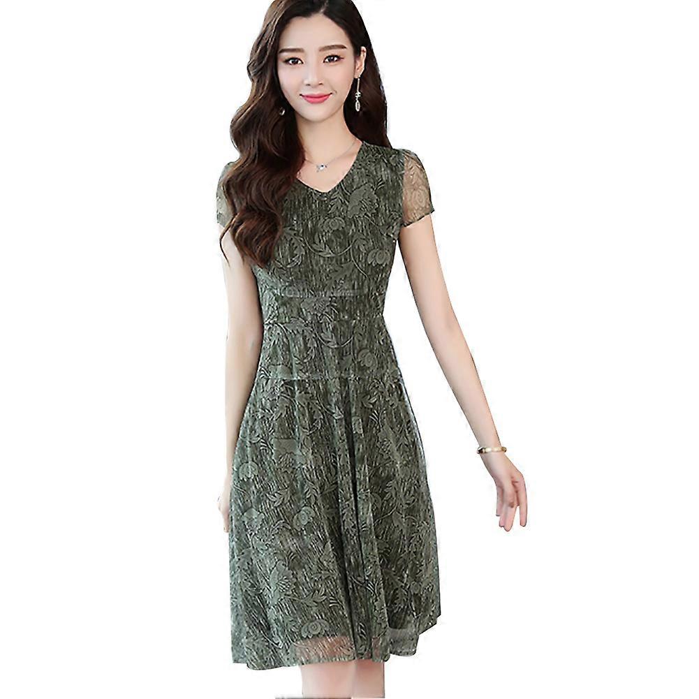 New Short Sleeve Chiffon Women Lady Sexy V Neck Midi Knee Length Dress (Green, 2XL)