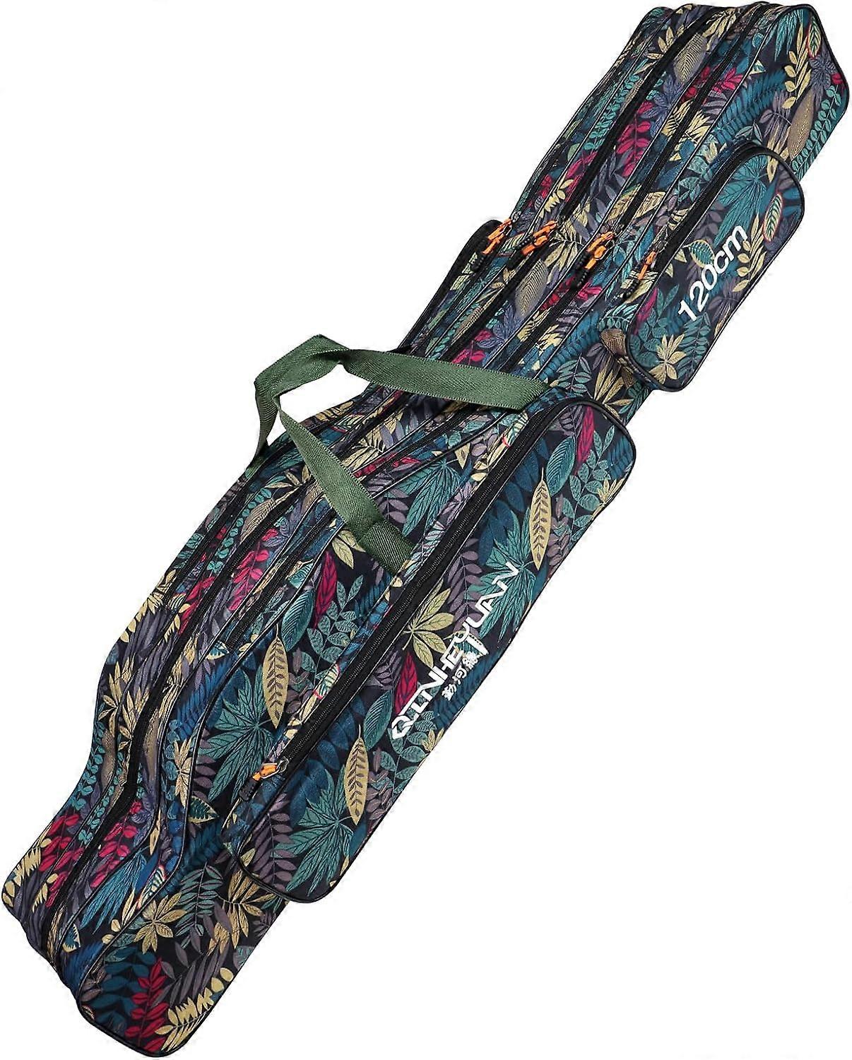 []---Dimensions: 47.2x7.9x5.9 inches, Belly height 9.8 inches. The fishing storage bag includes 3 main compartments and 3 outer pockets, the main compartment allows you to store more fishing tackles, such as rod, line, reel, and keep them neatly organized. The outer pockets can place lures and other small objects. .[Sturdy & ]---Made of sturdy 1200D oxford fabric, interior waterproof coated fishing reel storage bag is lightweight and waterproof. Thickened canvas fabric makes the fishing bag tear and scratch resistant, very strong and durable. The shaped steel wire around the edge is anti-extrusion, not easy to deform. .[ & Foldable]--- With a comfortable hand carrying strap and adjustable shoulder strap, the fishing carry bag is easy to carry, the reinforced handle can bear more weight, the connection between the shoulder strap and the bag uses a metal ring, strong and sturdy, not easy to break. You can adjust the length according to your needs, suitable for fishing and traveling. Foldable design is convenient for storage. .[Easy Access]---The fishing rod and reel organizer bag with wide mouth and double zipper is convenient for taking out and placing your essential fishing equipment, the zipper head is made of electroplating metal and tightly combined with the zipper teeth, smoothly pulled, not easy to break, saving your time and effort. .[Unique Design]---Designed with clear printing and camouflage appearance, the fishing reel case features delicate and smooth stitching with fine workmanship, which greatly adds the sense of fashion and beauty, a perfect gift for family, father, boyfriend, daughter and friends.