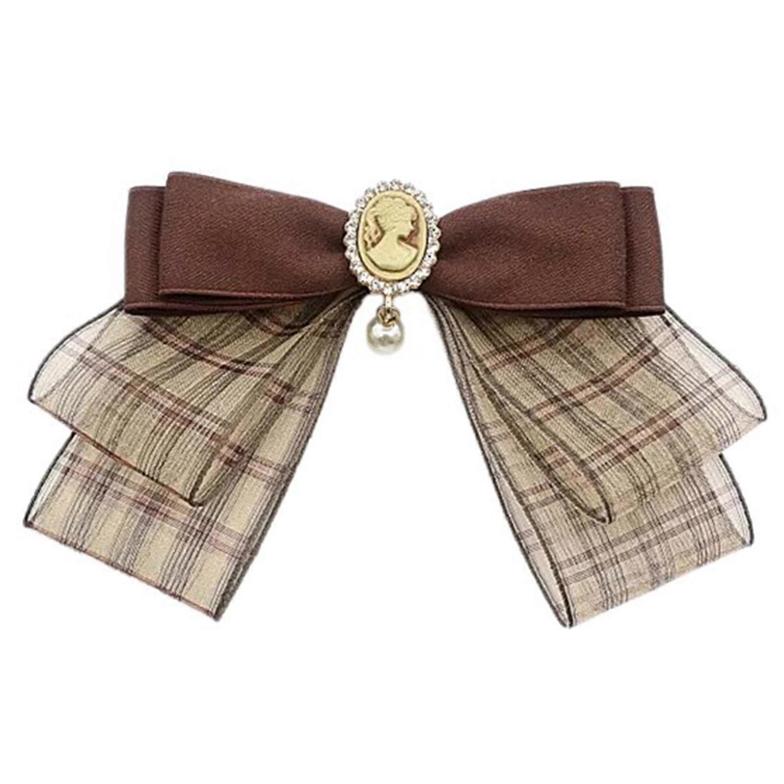 Japanese Ribbon Bows Tie Brooch Pin for Women Girl Vintage Brown Plaids Bowtie Pre Tied Bowknot Corsage Ceremony Necktie