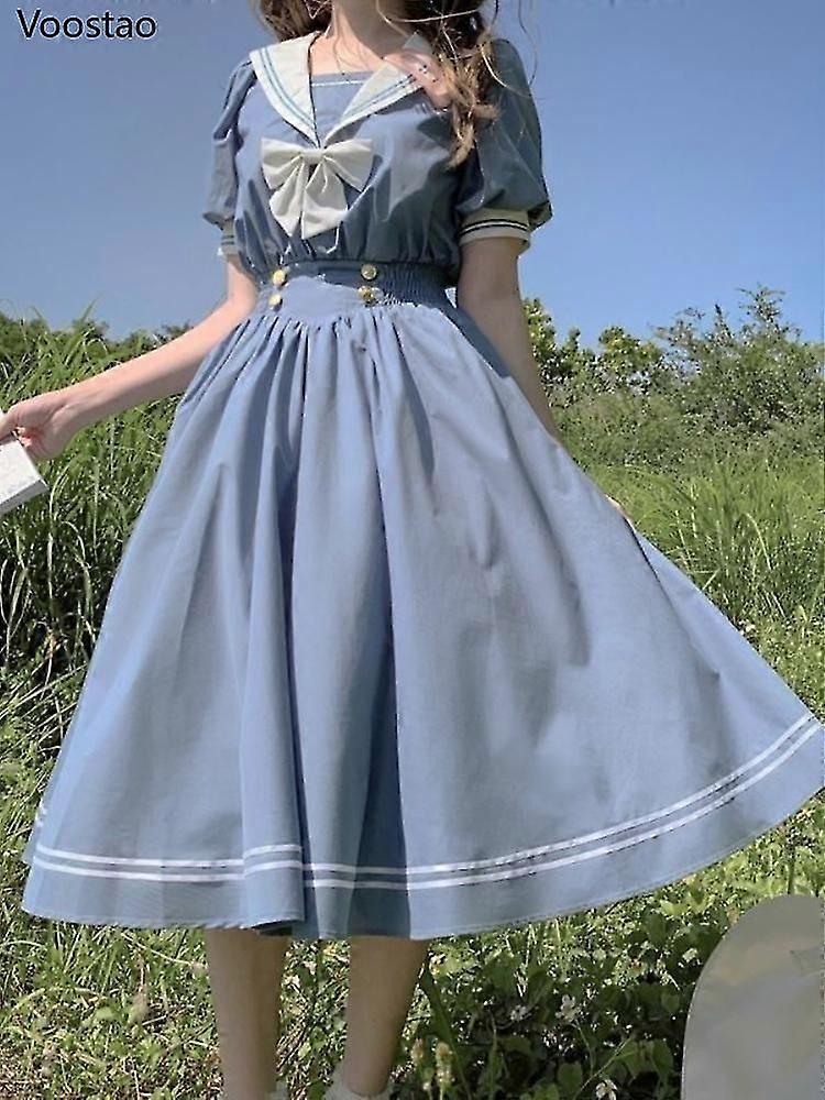 Japanese Soft Sister Cute Lolita Dress Women Sweet Puff Sleeve Slim Student Dresses Party Retro Girls Bow Salior Collar