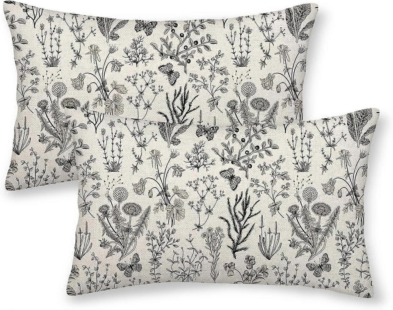 Spring Pillow Covers 12x20 Inch Set of 2,Black Gray Wild Flower Plant Throw Pillows Case,Seasonal Floral Outdoor Decorative Linen Farmhouse Decor Cush