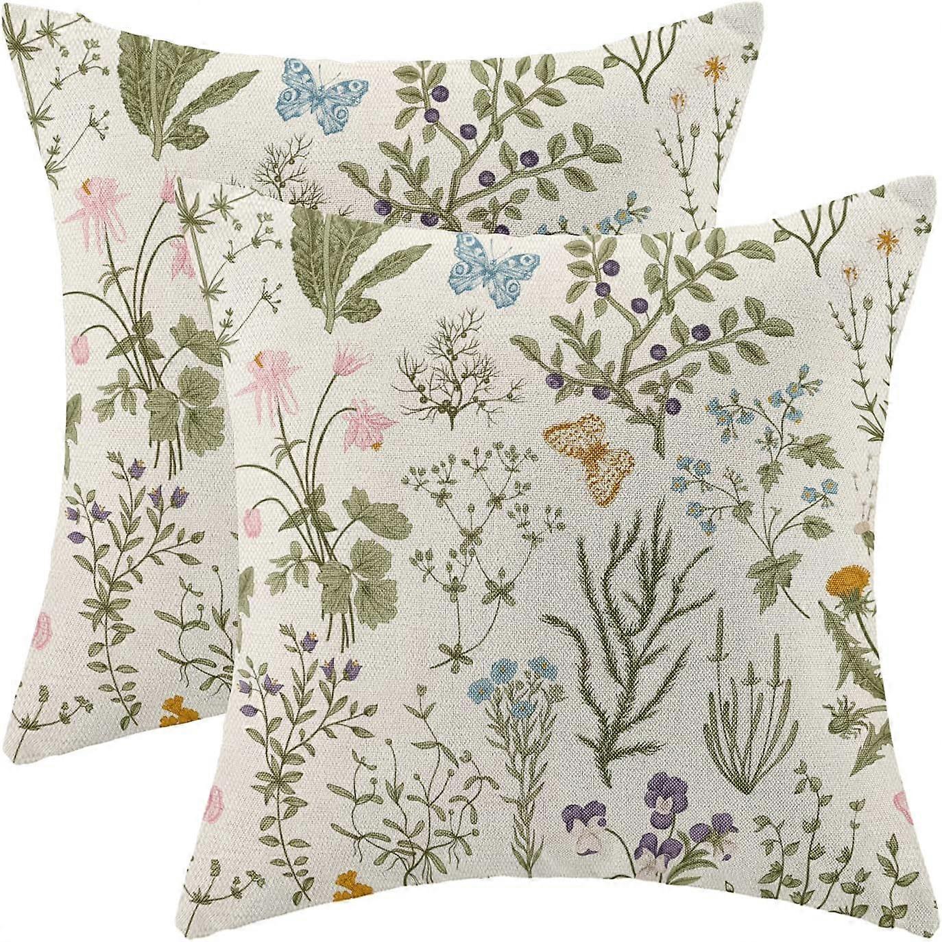 Spring Pillow Covers 18x18 Inch Set of 2,Sage Green Wild Flower Plant Throw Pillows Case,Seasonal Floral Outdoor Decorative Square Linen Farmhouse Dec