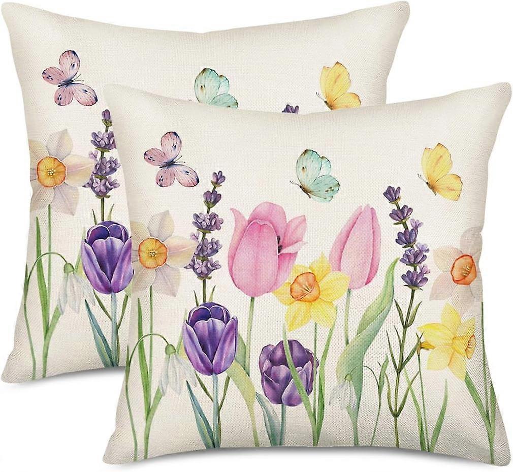 Spring Pillow Covers 18x18 Set of 2 Tulip Lavender Flower Decorative Throw Pillows Farmhouse Outdoor Linen Butterfly Summer Seasonal Floral Cushion Ca