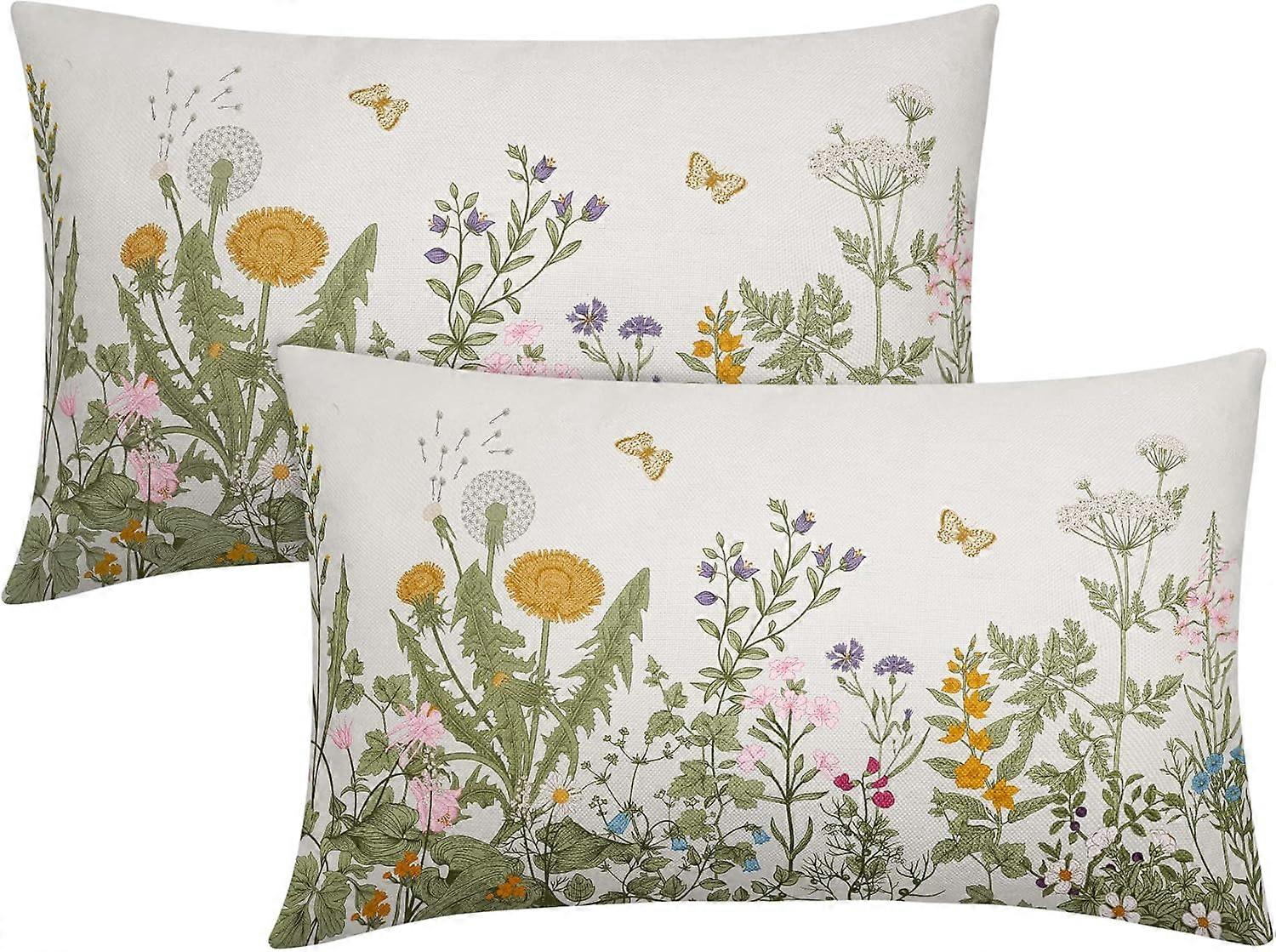 Spring Summer Rectangular Pillow Covers 12X20 Inch Sage Green Leaves Plant Lumbar Pillow Cases Yellow Butterfly Floral Throw Pillows Set of 2 Home Dec
