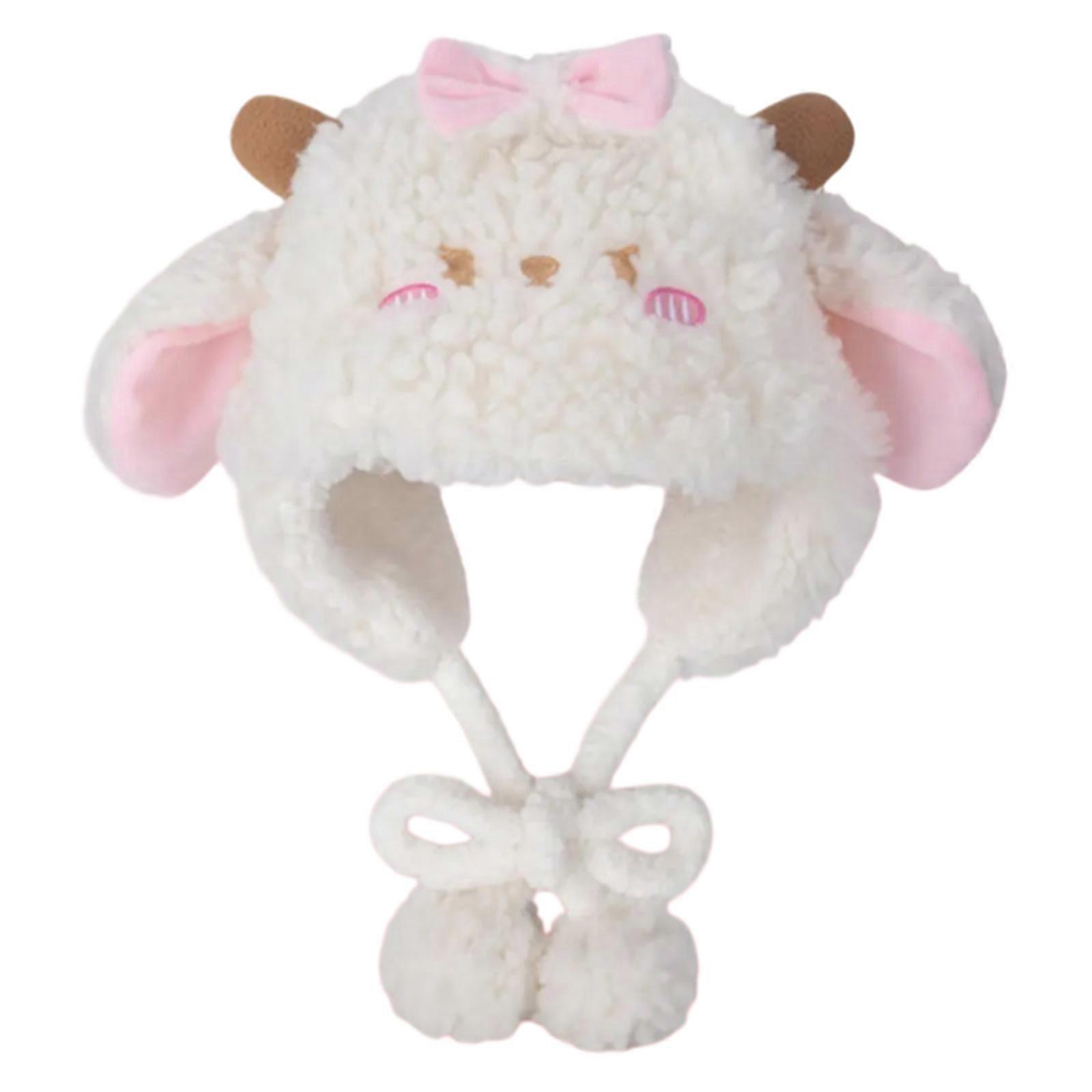 Lovely Plush Cartoon Sheep Hat with Warm Earflap Winter Activity Hat Lace Trim Pullover Hat Ear Protective Trapper Hat C