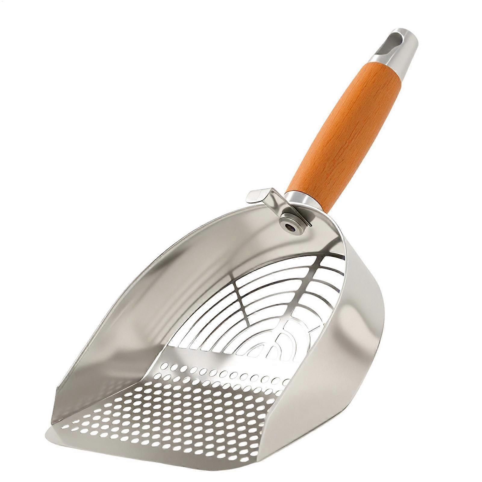 Stainless steel cat litter scoop with wooden handle, comfortable grip