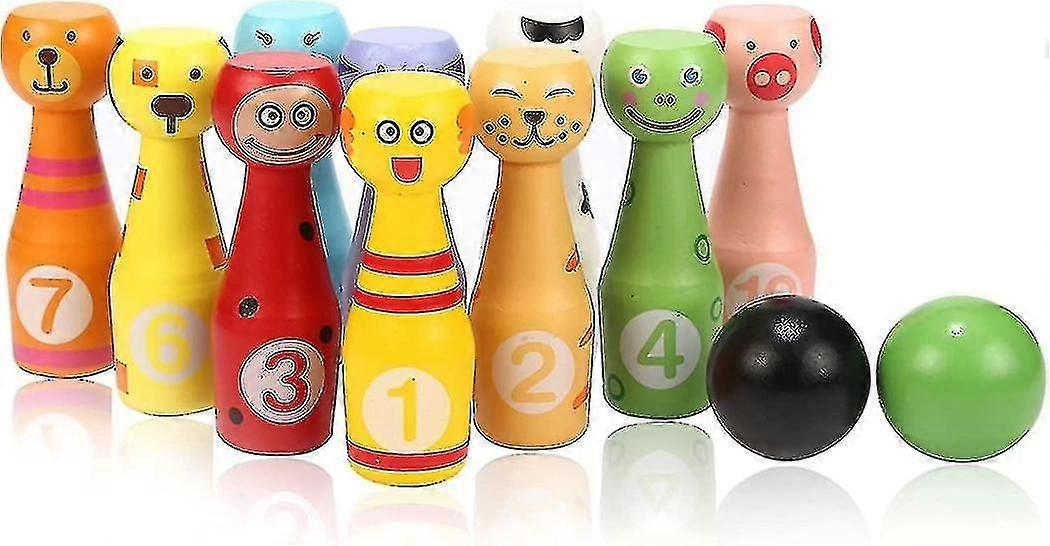 Unique DesignMade of quality wood with non-toxic finishes and brightly colored, smooth-sanded pieces.This fun-filled bowling set includes 10 bowling pins, 2 bowling balls.Each pins has numbers ranging from 1 to 10, so its an other easy way to teach basic numbers using this bowling toy, and also it helps in color recognitionEASY TO PLAY: Brush up on your bowling skills with this bowling game.Place pins upright, step back with the ball, take aim, and roll the ball to try and knock down as many pins as you can How many did you knock down?Whoever knocks over the most pins wins Also can range from a simple knock a sertain colour down to adding numbers together to see your score.Perfect for the increasing development of a childGREAT EDUCATIONAL TOYS: This wooden skittle set is suitable for kids to learn more bowling knowledge that help the kids develop animals recognition, counting skills, hand-eye coordination, and logical thinking ability.And it is great sport toy, improve kids" interested in sport, they can play together with parents and friends, enhance the interaction and social skills, which is a good game for childrenSUITABLE FOR INDOOR AND OUTDOOR: Durable set for indoor or outdoor use including living rooms, preschools, kindergartens & anywhere else.It is a great way to encourage your toddler to be active and get some exercise in an indoor or outdoor environment.Great present for birthdayparties or holidays (Christmas, Halloween, Thanksgiving & New Year).Toddlers and preschoolers will love the challenges and fun this toy providesOUR COMMITMENT TO YOU: Customer satisfaction is our number 1 priority.This skittle toy is made with safe material and approved EN 71 test.We offer you 100% Risk-Free Satisfaction Guarantee to let you buy with confidence.Any unsatisfied purchasing experience regarding any problem, feel free to contact us via emailExcellent bowling learning toy to promote active physical play and number recognition.Great gift idea for babies, infants, boys, girls, preschool children, toddlers, children, preschool children.This pet bowling set is particularly helpful for eye/hand coordination, fine finger and gross motor skills.Children can also gain self-esteem as they learn to flip the pens, and they can play in the team to improve their communication skills, social skills and life skills.