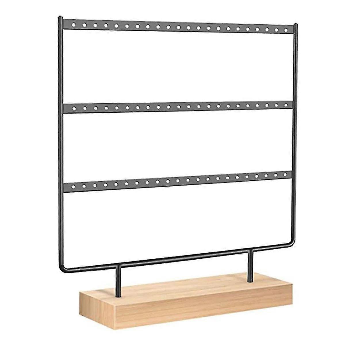 Product : Earring Display StandMaterial: Solid Wood + IronColor: BlackSize: 32*27*7cm</p >Package Content: 1 Piece 1. EARRING HOLDER - Perfect for jewelry organization or professional display in retail stores or trade shows. Suitable for any room decoration. The earring organizer not only decorates your table, but also can be placed on the nightstand and wardrobe frame. Jewelry NOT included. 2. 69 EARRING HOLES - This earring organizer can hold up to 34 pairs of earrings. You can hang your favorite studs, dangle earrings, and hoops with ease. No more worrying about losing the backs of your earrings. This earring stand can accommodate snap backs, screw backs, butterfly backs, and clasp backs. 3. LARGE STORAGE CAPACITY: 3-layer earring organizer provides more spacious storage space for you to organize and display earrings, studs, rings, etc. If you have more earrings to store, it will be a good choice for you. 4. PERFECT FOR JEWELRY DISPLAY: It is the best choice for you to display jewelry with elegant design, both the front and back sides can be fully displayed. Constructed of solid wood and metal, tray design allows quick access to your earrings, studs, rings, etc. 5. MATERIALS: Solid wood base and sturdy metal rod design, ferroalloy appearance shows your jewelry more noble and classic; You will be able to hang your favorite earrings, studs, and hoops with ease; Keep your jewelry organized, easy to pick and choose.
