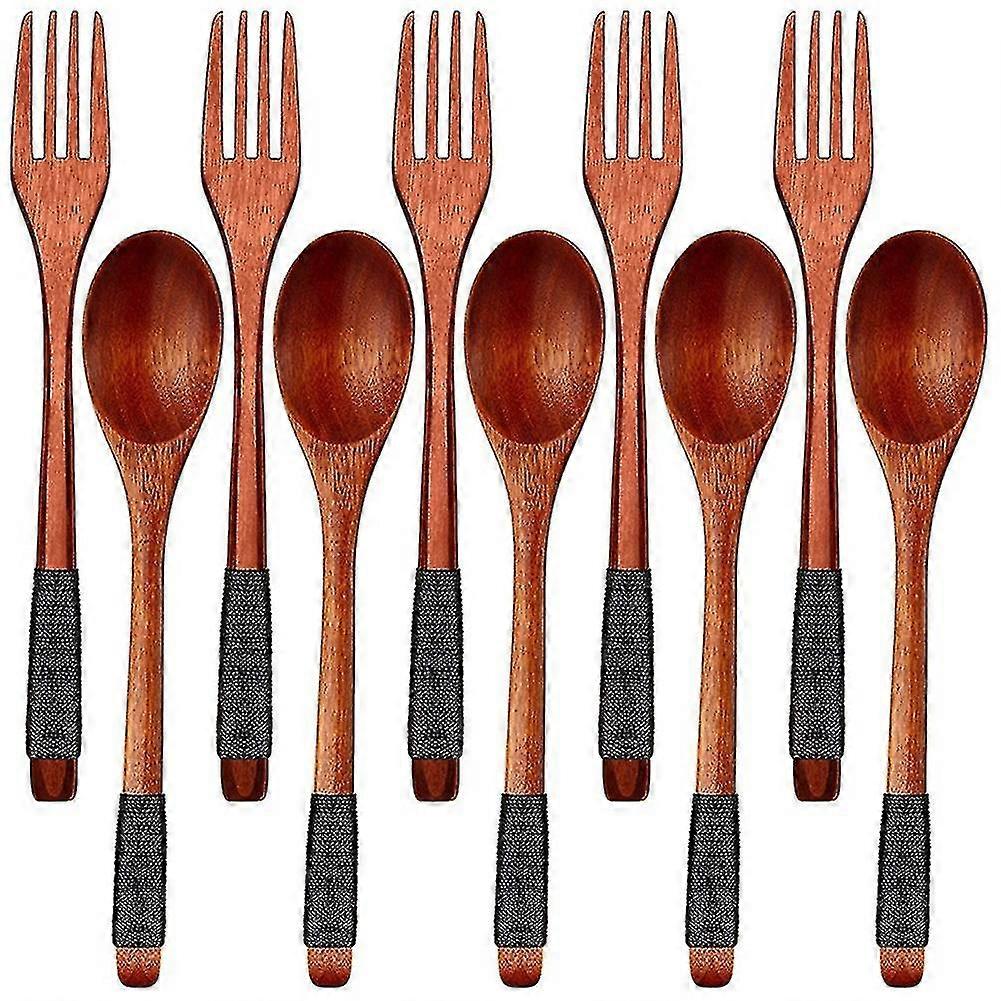 all of them are tied with cords, Japanese style makes them look more exquisiteSafe and smooth: these handmade cooking utensils are made of quality wood material, non-toxic and durable to use, no crack or odor, safe for foods and your usesDelicate design: long handle spoons and forks are nicely polished, not only making them look nice, but also offering people a comfortable using experience, the long handle design allows to be applied for cooking without hurt yourselves, the black cords tied on the handle of each spoon and fork can bring you a good mood while eatingDiverse applications: this Japanese style reusable handmade wooden flatware set is suitable for different foods, you can apply spoons for soup, rice, dessert, ice cream, beans, apply forks for eating noodles, vegetable salad, fruit salad and moreNice gift choice: exquisite workmanship, the wooden color and Japanese style make these spoons and forks good gifts for classmates, friends, parents, kids, relatives on birthday, Christmas, Thanksgiving Day, New Year, etc.Colour:BrownMaterial:WoodSize:22.5cmPackage Contents:5 x Wooden spoons5 x Wooden forksOnly the above package content, other products are not included.Note: Light and different displays may cause the color of the item in the picture a little different from the real thing. The measurement allowed error is +/- 1-3cm.