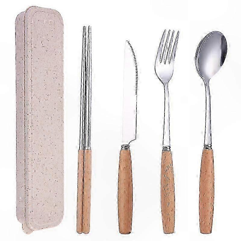 Combined with a wooden handle and unique design, this set is exquisite and elegant. Super durable with a mirror-polished finish, it is long-lasting and resistant to bending or deformation. Heat-resistant, reusable, and rust-free. Easy to carry: Packed in a reusable, high-quality case that keeps your flatware clean and protected. The travel bag is ideal for travelers and can be carried in your bag or backpack daily, helping reduce the use and waste of disposable plastics. A handy tool for everyday use. Multi-purpose: The portable spoon, fork, knife, and chopsticks set is versatile and suitable for dinner, parties, work, camping, hiking, backpacking, picnics, school, BBQs, flights, and outdoor activities. Travel case included: Keep your utensils clean and organized with the included travel case. An eco-friendly alternative to plastic utensils, this durable and reusable cutlery set is ideal for work, camping, hiking, backpacking, picnics, and more. Made from high-quality, heat-resistant materials. Color: Natural wood color, silver Material: Stainless steel, wood Dimensions: Chopsticks: 22 cm Spoon: 21 cm Fork: 21.5 cm Table knife: 20.4 cm Box: 24.5 cm Package Contents: 1 x table knife 1 x chopsticks 1 x spoon 1 x fork 1 x storage box Note: Light and display settings may cause slight color variations between the image and the actual item. Measurement allowance is +/- 1-3 cm.
