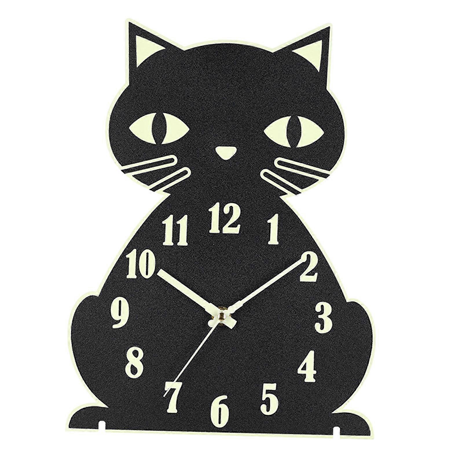 Wooden Cat 12'' Wall Clock Glow Dark Non-Ticking Clocks Watch