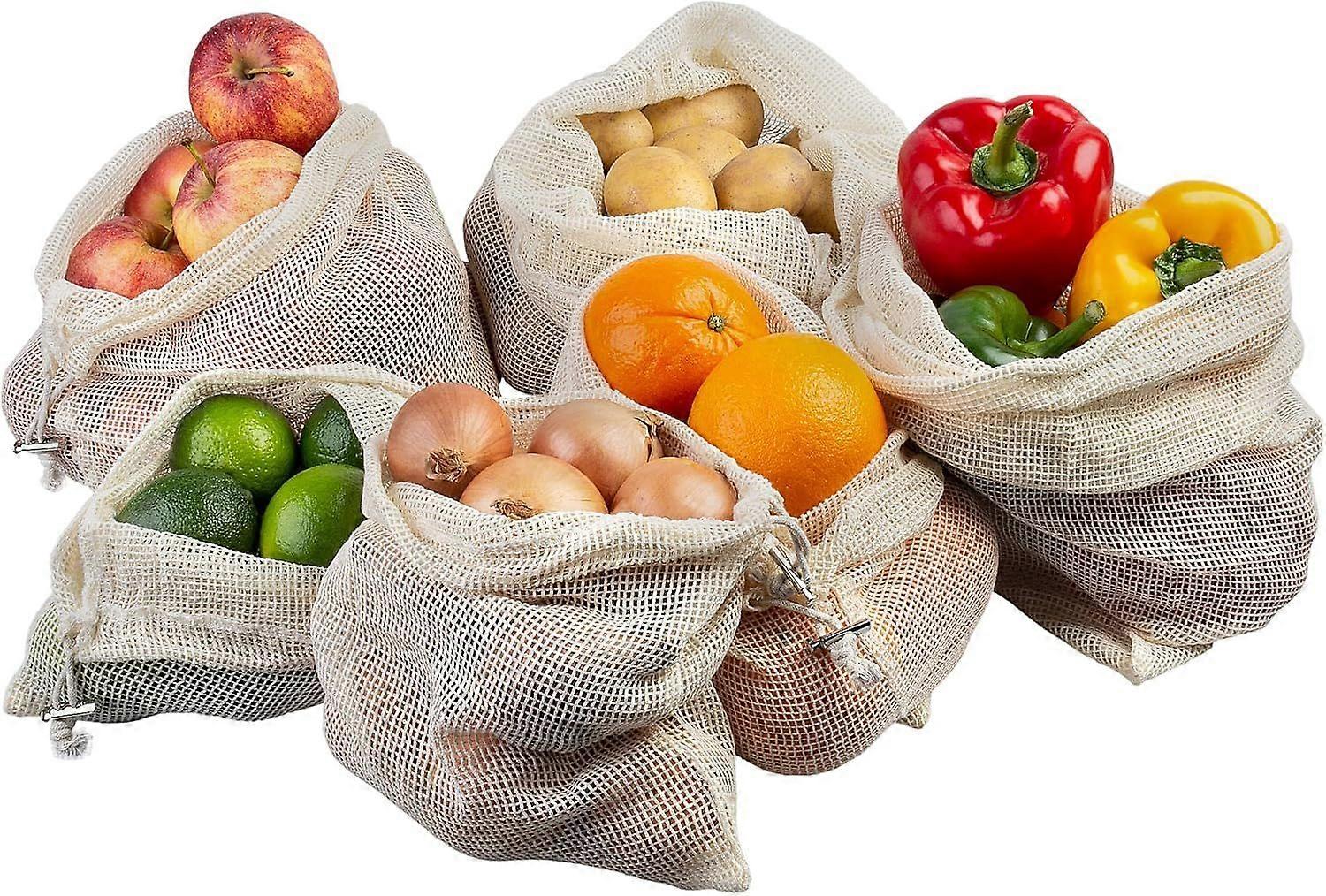 Fruit and Vegetable Bags, 6 pcs. in 3 Sizes, Reusable Net Shopping Bags, Cotton