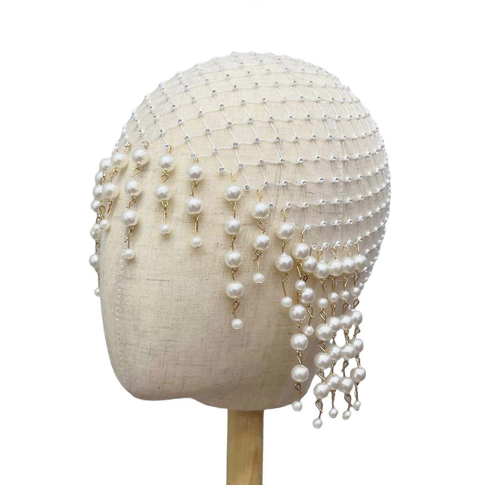 Soft and Secure Pearls Tassels Hair Hat Exquisite Pearls Tassels Headwear Handmade Hollow Out Designs for Ladies Fashion White