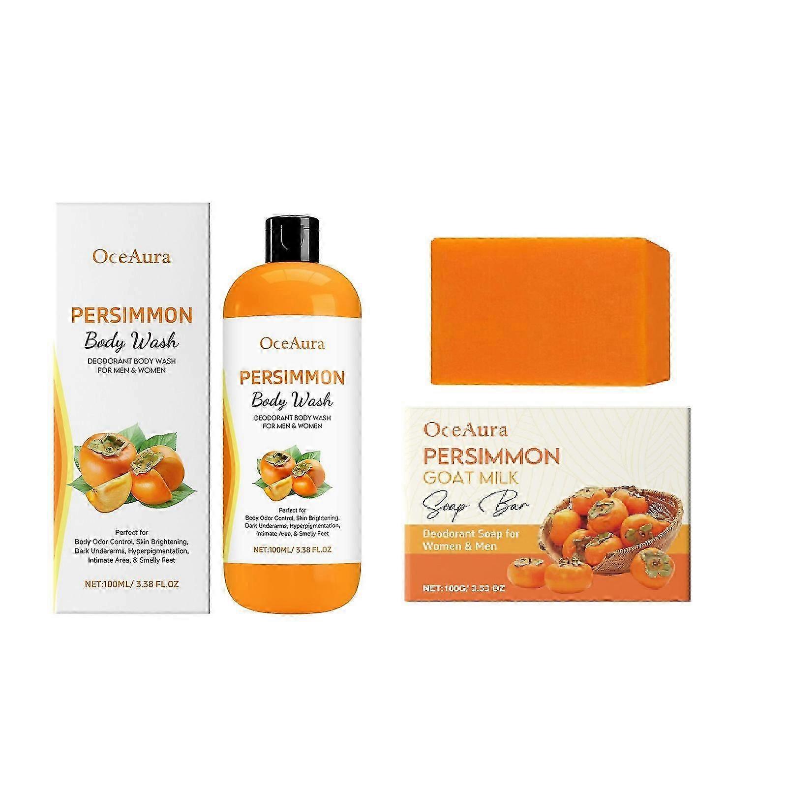 Persimmon Body Wash + Persimmon Soap Bar Set for Body Odor Control, Purifying Deodorizing Body Soap for Eliminating Odor, Skin Brightening ODOR BLOCK BODY WASH: Elevate hygiene with our potent persimmon body wash, perfect for combatting body odor, including a specialized Persimmon soap for old people. Ideal for smelly feet, stinky armpits, and more. Persimmon's odor-blocking prowess ensures a clean, fresh feel.HYDRATING, GENTLE ON SKIN: Enriched with persimmon, our body wash offers more than cleanliness. Experience moisturized, soft, soothed, and supple skin. This deodorizing soap with persimmon is non-drying, maintaining its gentle nature, including a Deodorant body wash for added freshness.ALL NATURAL ODOR BLOCK WASH: An all-natural remedy for body odor, our persimmon goat milk soap is the best body odor soap for smelly feet, stinky armpits, feminine odor & more. An effective odor blocker, persimmon instantly neutralizes funky smells.EFFECTIVE, GENTLE-ON SKIN: Persimmon body wash deliver moisturization and gentleness, catering to various needs. A non-drying solution, it effectively combats body odor, providing a soothing touch for clean and odor-free skin.FOR MEN, WOMEN, & KIDS: Versatile for everyone kids, older adults, or stinky teenagers! Crafted from the earth's purest oils, this deodorant body wash gently exfoliates, brightens the complexion, and combats foul body odor for a clean, fresh experience.