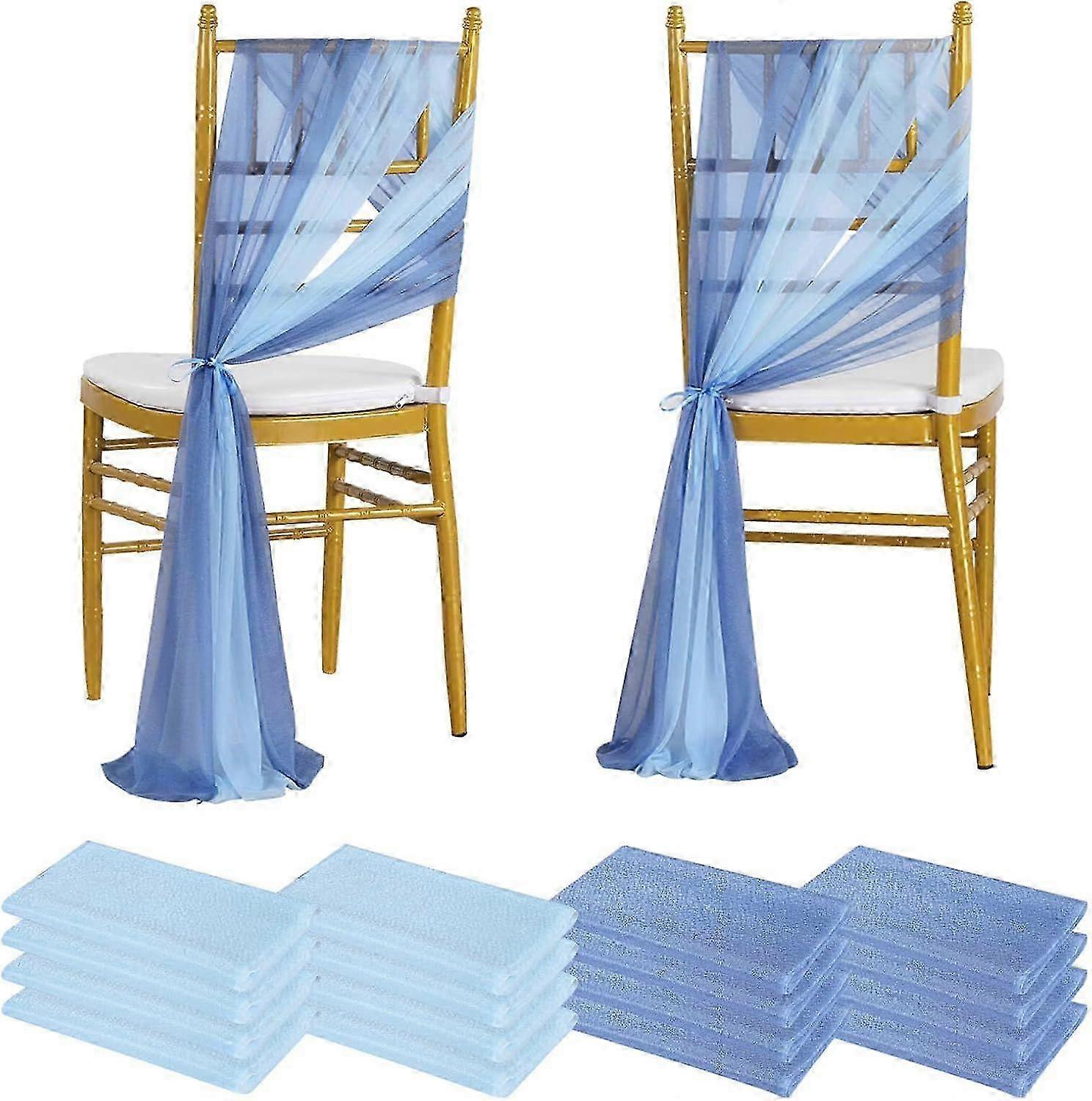 Wedding Aisle Decor Package: Set of 16 Packs (8 each of Light Blue chair sases and Dusty Blue chair sases), 8 clear non-marking tapes, and 10 meters ribbons.Material: Chair sashes are made of chiffon, semi-sheer and soft fabric, aesthetic and comfortable, easy to tie.Chair Covers Size: Chiffon fabric measures 8ft length 10 Inches width. Easy to tie to any size or type of chair, you just need to t it on the chair and the tape can fix the sashes in the position you want.Occasion: Elegant tulle chair sashes perfect for wedding decor, wedding ceremony,wedding aisle, hall, reception, banquet, home decorations.Care instructions: Machine Wash in a laundry bag or hand wash in cold water, mild detergent only. Do not bleach and twist. Reusable.