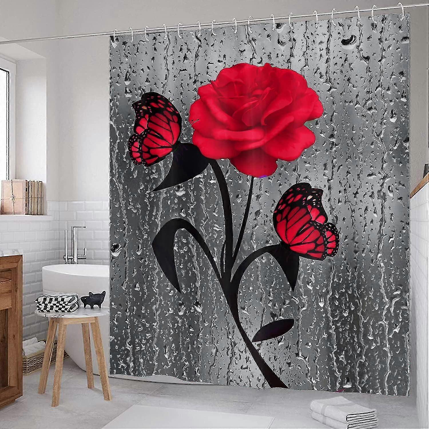 Large Red Flower And Butterfly Black Flower Branch Waterproof Shower Curtain In Simulated Metal 180x180cm