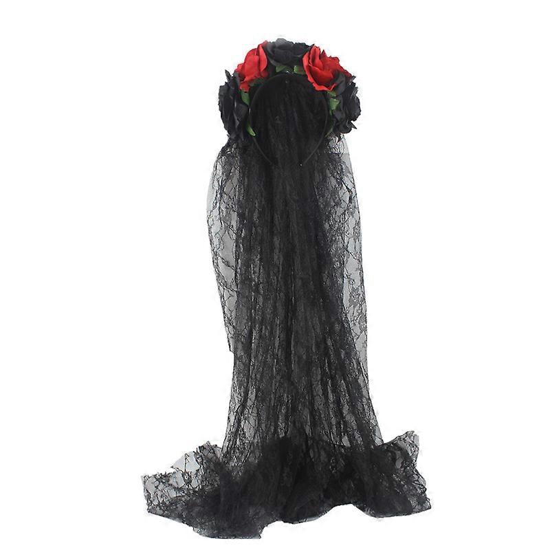 Day of the Dead Headpiece Rose Floral Crown Halloween Costume Mexican Headband with Veil1pcsred+black