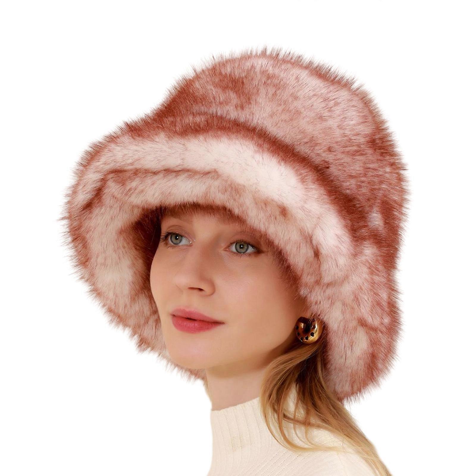 Furry FauxFur Fisherman Hat Thick Warm Bucket Hat Russian Hat for Teens Adult Outdoor Activity Soft Cap Photo Headpieces Earthy red