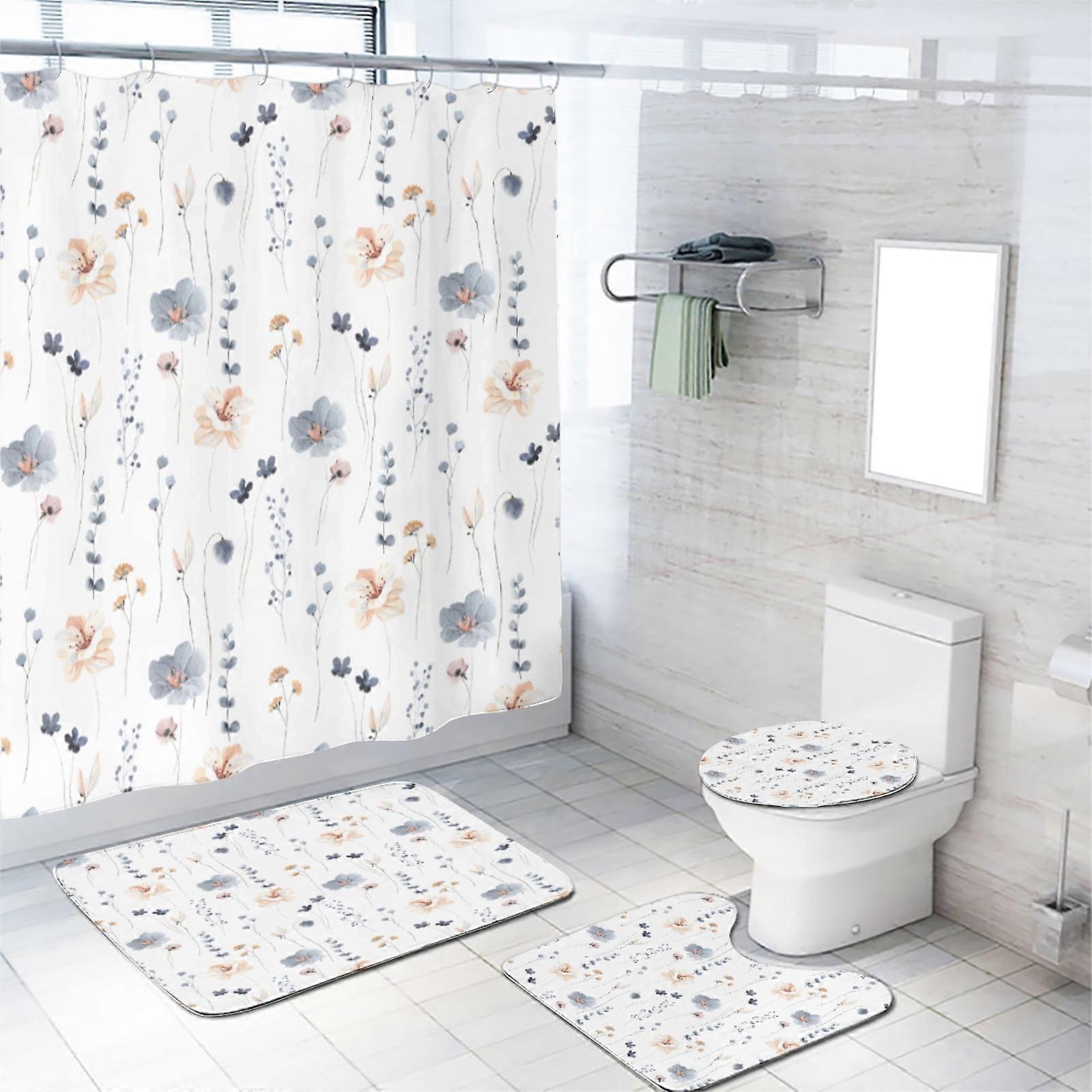 Watercolor Flower 4PC Shower Curtain Set with Non-Slip Rug, Waterproof Bath Curtains & 72x72 Bath Mats, Floral Plant Nature Design