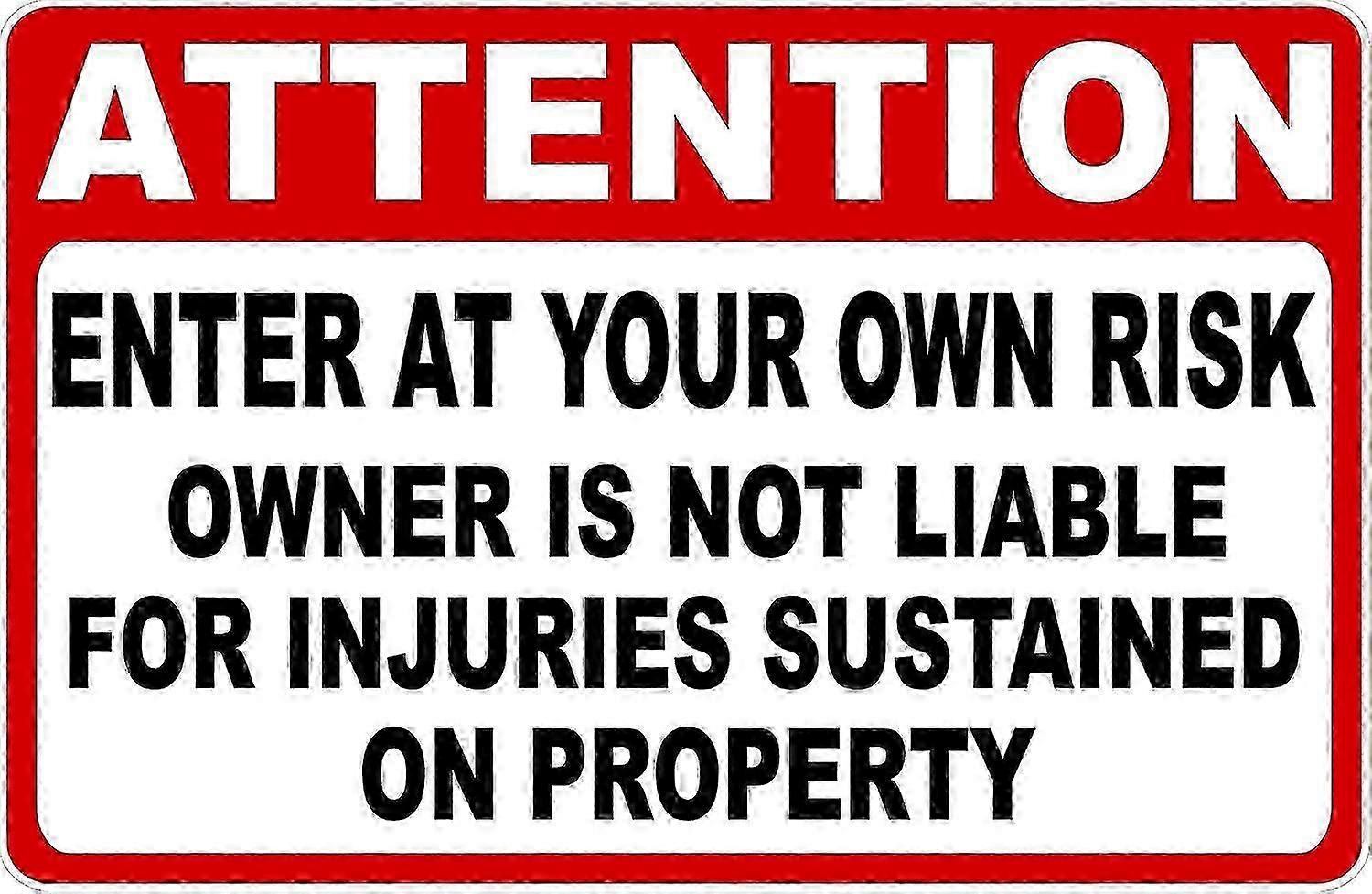Attention Enter at Your Own Risk Owner Not Responsible for Injuries Sign. 12x18 Metal.