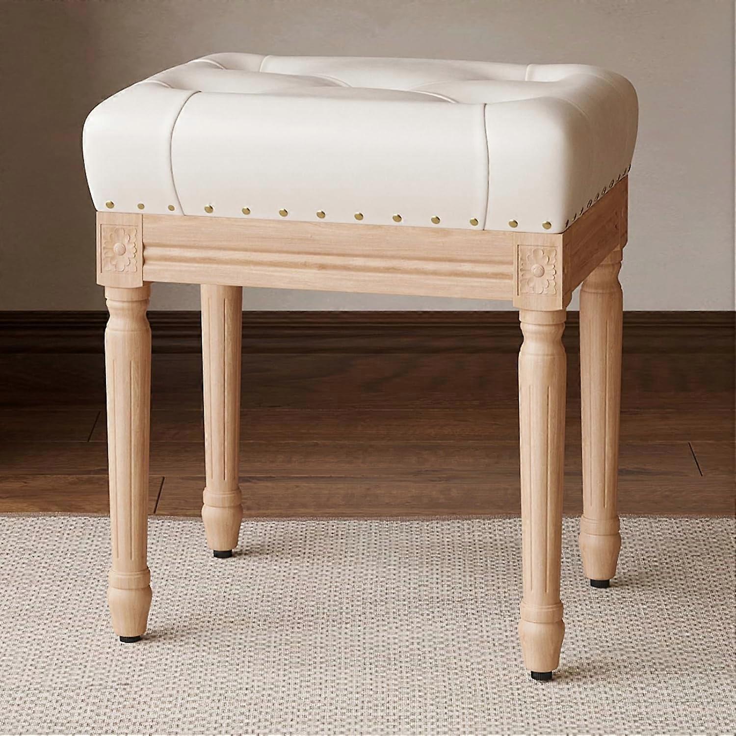 Vanity Stool 19" Ottoman Bench Bedroom, Tufted Makeup Chair, Faux Leather Ottoman with Vintage Wood Frame, Small Bench for Living Room & Foot Rest