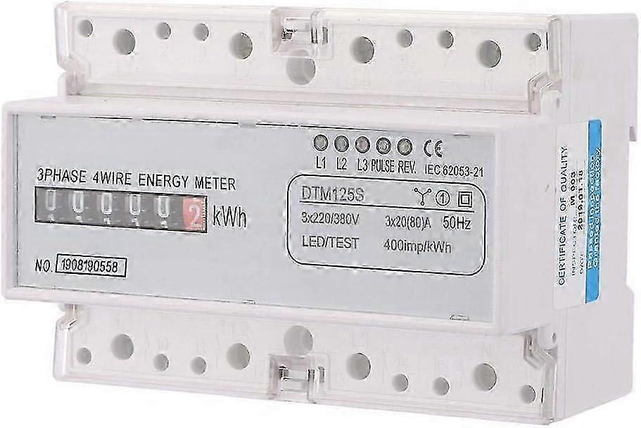 Installation method: standard 35mm DIN rail mounting, conforming to DIN EN50022.10, width (12.5mm module), conforming to DIN43880. Two modes connection: direct connection, you can select two connection modes. Standard S-type configuration wiring, you can select U-type wiring. Model specification: DTM125 S. Voltage specification: 3x220V/380V 50Hz, current specification: 3x20 (80) A (reference current, maximum current). LED indicates: The two-color LED indicates the current status (green) and the energy pulse signal (red). Standard configuration : standard configuration for pulse output passivity (polarity), selection of remote pulse output passivity (non-polarity) and easy contact with various AMR systems according to IEC 62053-31 and DIN 43864 standards. < p>Feature: The DTM125S three-phase electronic power meter is a new generation of smart meters featuring large integrated circuits, advanced digital technology and SMT technology. The technical performance of the product fully complies with the requirements of the active watt-hour power meter of class 1 of the international standard IEC 62053-21. Digital display with standard configuration 5 + 1 (9999999.1KWh). AC rotation direction measurement has functional consumption. It is regardless of load current direction. It corresponds to IEC 62053-21 standard. Specifications: Model: DTM125S Accuracy: Level 1 Voltage specification: 3x220V/380V 50Hz Current specification: 3x20 (80) A (reference current, maximum current ) Insulation power: AC voltage 4KV, 1 minute, pulse voltage 1.2/50us, 6KV Display mode: digital display < p>Installation Mode: Rail Mount (35mm) Package List: 1 * Electricity Meter