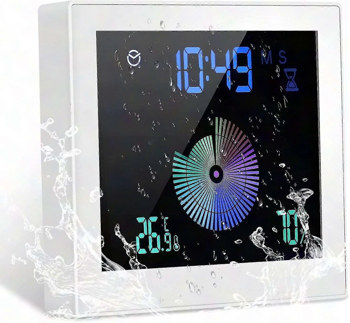 4 in 1 Electronic Shower Clock: The large LCD screen can display time, temperature C/F, humidity, 12/24 hour format, alarm and countdown. The waterproof digital clock can be used to manage the temperature and humidity of the baby's room, check the time during shower or makeup, set the timer alarm when cooking, etc., use- the according to your needs.Temperature and humidity alarm function: the temperature range is 0C to 50C to 122C. The hygrometer range is 20% to 99%. If the temperature and humidity exceed the preset When the upper limit is set, the backlight will display red and flash for an alarm. When the temperature and humidity exceed the preset lower limit, the backlight will display orange and an alarm will flash.Alarm clock countdown: built-in three touch control buttons, just select the mode countdown from 1 minute and 10 minutes. The countdown can be set from 1 to 99 minutes. After the countdown starts, the digital shower timer will display a circular dynamic time travel mode with color gradient, and when the countdown ends, it will flash and turn on the alarm function. The timer alarm is loud and clear, but not deafening.Four installation methods Use the clock stand to place it on the dresser, desk or shelf. Use the suction cup and traceless self-adhesive hook to attach to glass, windows, mirrors and tiled walls. Install it on the wall with a traceless nail. When using the suction cup, first moisten the suction cup and the wall, then avoid moving the timer.Splash proof: IP65 waterproof, the suction cup wall clock is perfect for use in the home. bathroom, shower and kitchen. Ideal as a timer above the bath, washbasin or kitchen sink or even in the shower to keep an eye on the time and save water. Avoid placing the digital timer directly in front of the strong water jet, as it has a high sensitive touch screen which may cause timer alert issues.USB DC Power Line Power Supply: When the DC power line is plugged in for power, the backlight will turn on for 8 seconds. If the backlight is still on, you can press and hold the [CLEAR] key for more than 2 seconds, then turn on the backlight state after Bi sound. If you need to close it, you can also press and hold the [CLEAR] key for more than 2 seconds.Note: The data is manual measurement, please allow error 1-12cm, due to differences between light and screen, there will be a certain color difference, the specific received in kind prevail.