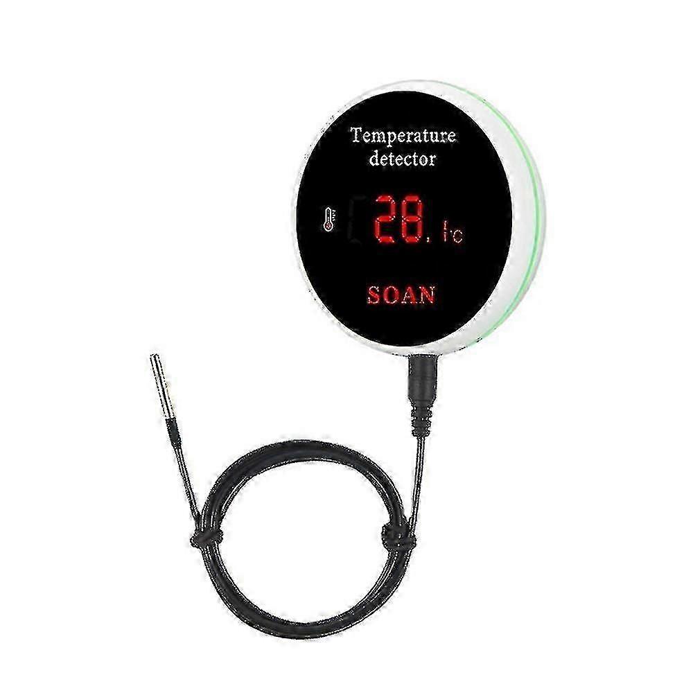 Name: Circular Digital Temperature And Humidity External Sensor Product Model: SNT957W-dE Working Voltage: 5V1A Product Power:1.5W Built-in Rechargeable Battery: 3.7V/600mAH Battery Standby Time:5 Hours Alarm Indication: Digital Tube Numbers Flash. (such As Temperature Alarm Flashing Temperature Numbers) Network Distribution Instructions:-SC--AP- Detection Ambient Temperature: -40C-+120C Detection Of Ambient Humidity: 0% To 100% (no Condensation) Temperature And Humidity Measurement Accuracy: 0.5C; 1%RH: Measurement Error: 1C; 3%RH: WIFI Frequency Band: 2.4GHz, The Frequency Band Does Not Currently Support The 5GHz Frequency Band Buzzer Time:30s Product Size: Diameter 77.8mm, Thickness 20.8mm (including Self-adhesive) Features: 1. Atmospheric Light Transmission, Accurate Measurement, Soft And Eye-friendly 2. WiFi Direct Connection, No Gateway Required, No Mobile Phone Card Required 3. After Detecting The High Temperature Alarm, Respond Quickly, The Alarm Will Sound On Site, And The Mobile Phone Will Also Sound An Alarm Prompt. 4. Use WIFI Communication To Upload Data To The Cloud Platform, Access The Cloud Platform Through The Mobile Phone, View Monitoring Data In Real Time, And Quickly Understand The Current Operating Status Of The Equipment. 5. Temperature And Humidity Data Records Can Be Exported And Viewed. Imported Sensors, Professional R&D Team, High Measurement Accuracy, Good Stability, Low Power Consumption Chips, And Stable And Reliable System Operation. Package Included: 1 set * (1 thermometer, 1 sticker)