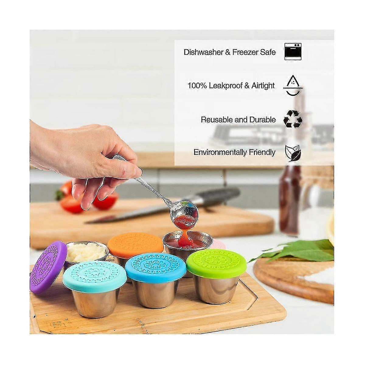 100% Leak Proof & Airtight: This salad container is 100% leak-proof, you ' have to worry about condiment cups spilling all over your bag. Good sealing small containers with make your food, dips retain .Dishwasher & Freezer Safe: You can cover unfinished dips with silicone sleeves and in the refrigerator to prevent odors and keep . Salad container for bento is also suitable for dishwashers, which is convenient and quick.Reusable and Durable: Small containers with are made of stainless steel, which is more durable. Compared to small plastic salad containers ours are more environmentally friendly, reusable and easy to clean. reduce the use of plastic, and replace plastic with environmentally friendly 304 stainless steel small containers with . stainless steel dipping sauce cup is only 2.5 ounces, which is convenient to carry . The 6-piece set can meet your small-capacity and multi- needs. Perfect for school or work lunches, picnics, barbecues, parties, travel, etc.The combination of the soft silicone lid and the handle is not only cute also easy for children to open. The rainbow color translucent lid is and can also be used to distinguish the different sauces in the container. The colorful set can meet the various preferences of adults and children.Colour:Photo ColorMaterial:Stainless steel + siliconePackage Contents:6 x stainless steel cups6 x silicone Only the above package content, other are not included.Note: Light reflection and different displays may cause the color of the item in the a little different from the real . The measurement allowed is +/- 1-3cm.